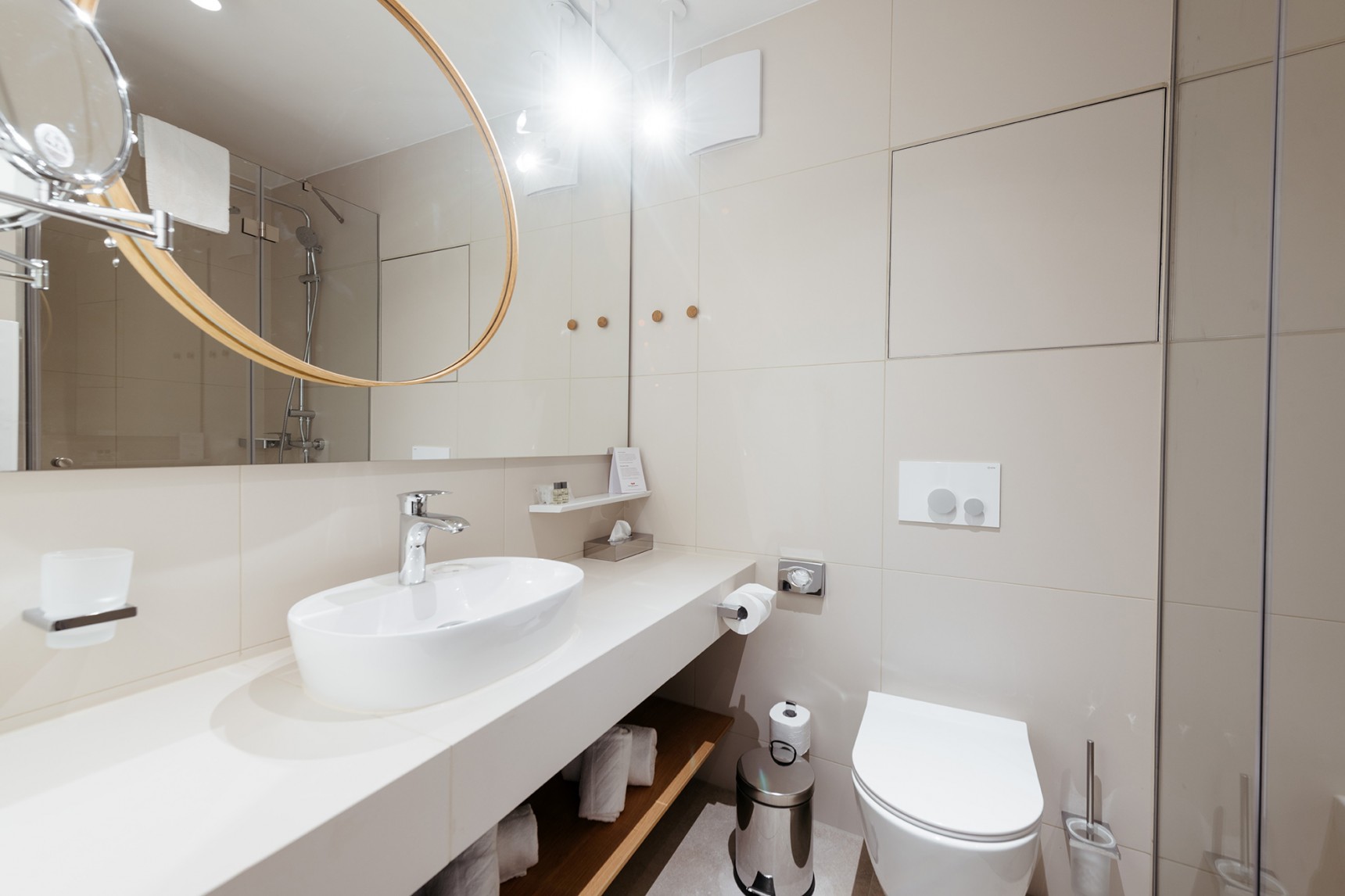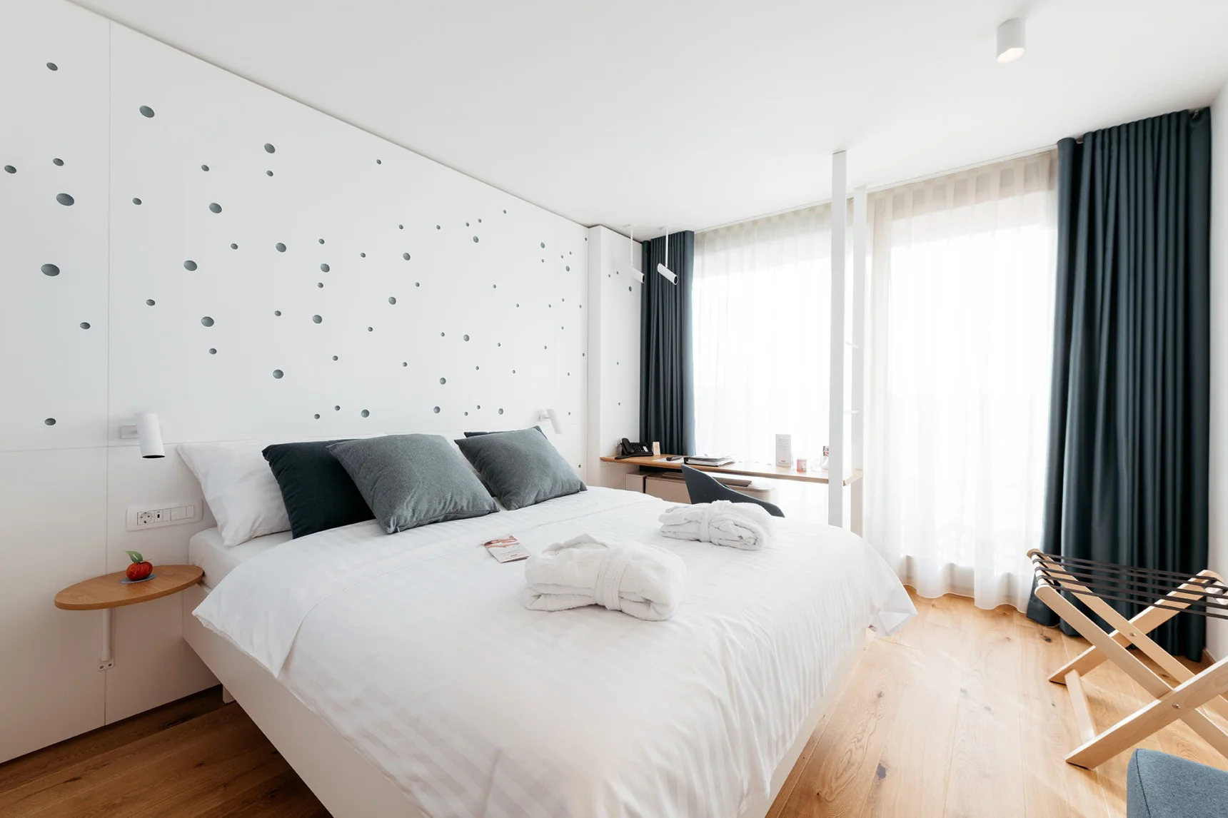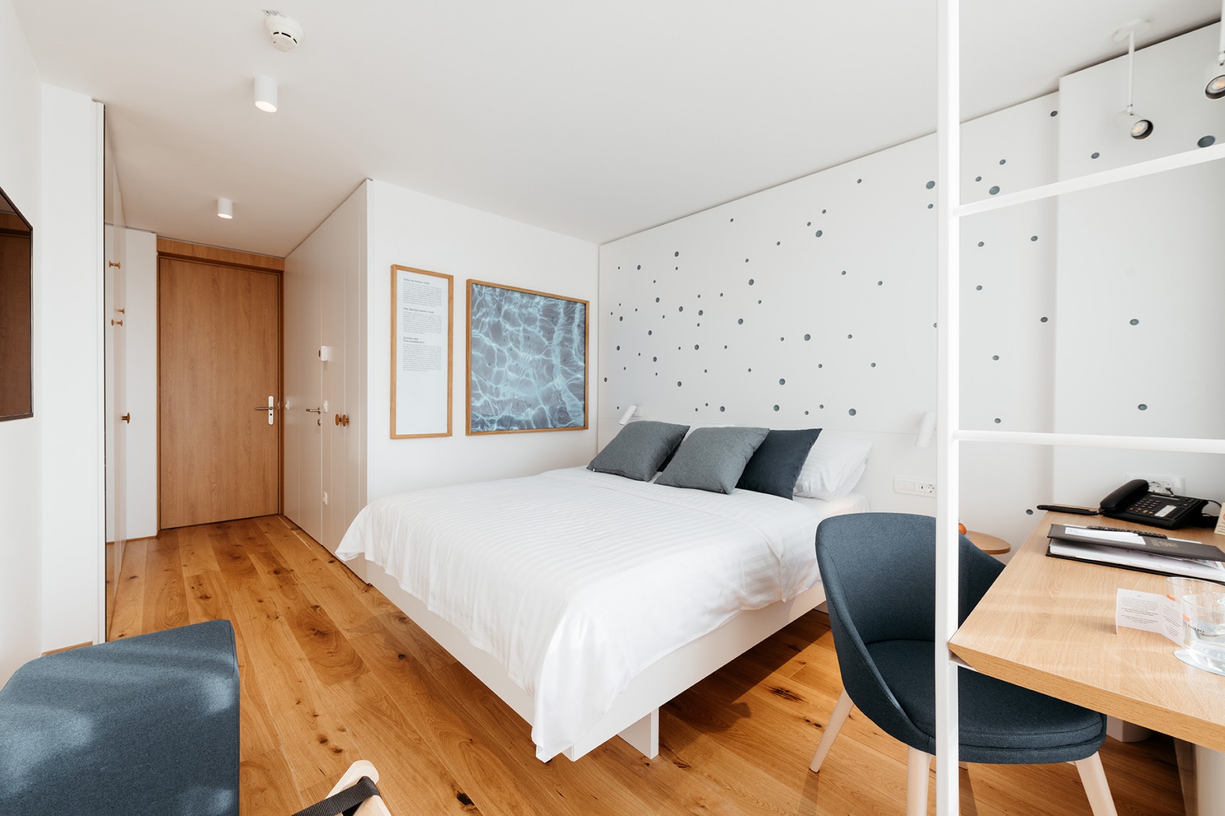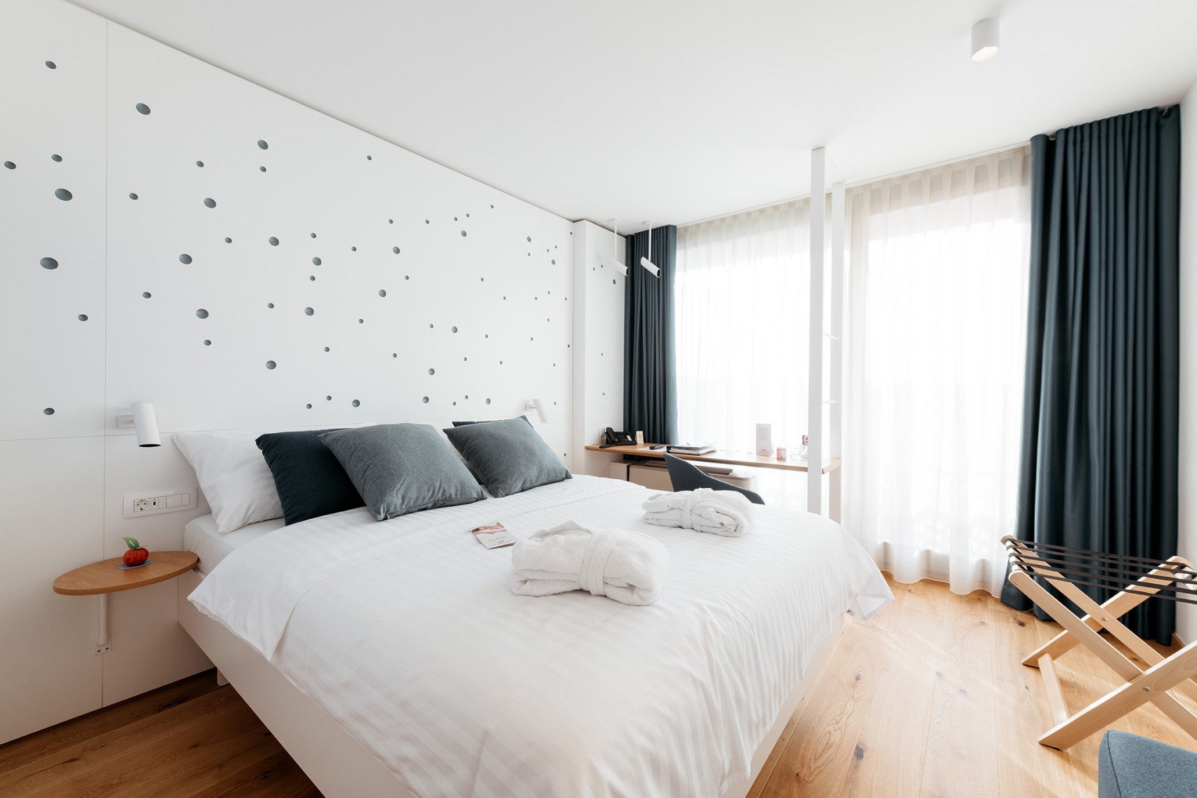 Gemütliches deluxe Doppelzimmer mit französischem Bett (160 cm) und Parkblick. Im Zimmer mit einer Größe von 16,5 m2 befindet sich ein Badezimmer mit Dusche und WC, ein Schreibtisch und Balkon.
