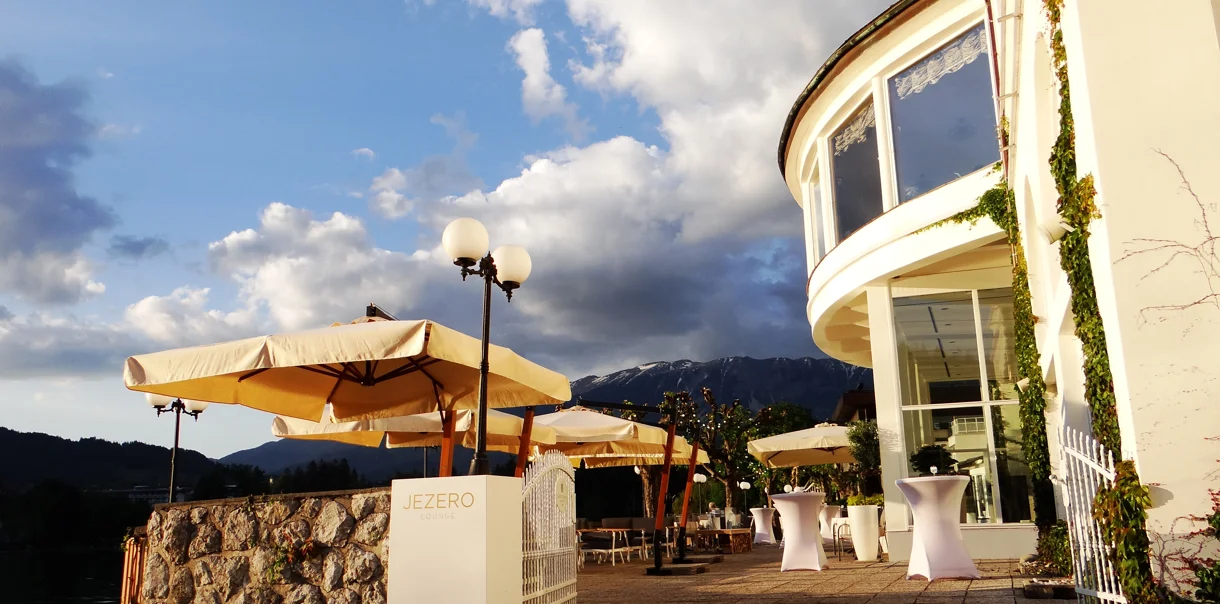 Die Jezero Lounge im Grand Hotel Toplice bietet auf der Sommerterrasse unter den Kastanien am See eine Auswahl an Getränken, Snacks und Sushi.