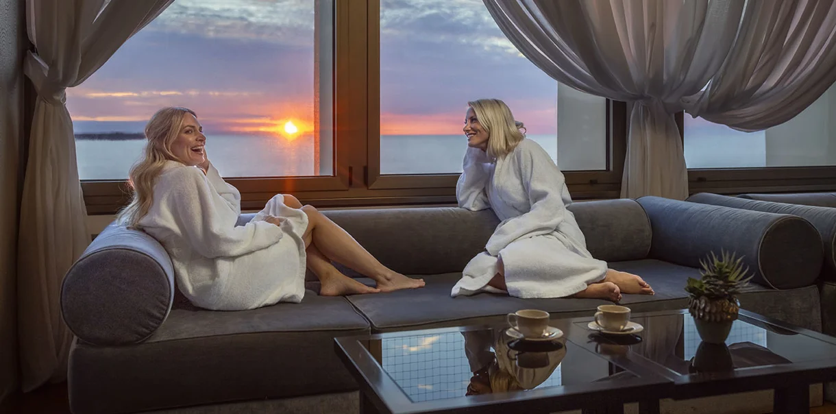 In der Spa Bar im Wellness-Zentrum Paradise Spa können Sie sich beim Ausblick auf das offene Meer und die Bucht von Piran einen erfrischenden Natursaft oder Tee und frisches Obst servieren lassen.