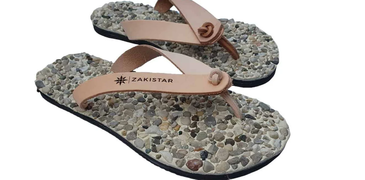 Einzigartige Flip-Flops mit Sohlen, in die kleine Kieselsteine aus der Mur zur Fußmassage eingelegt sind.