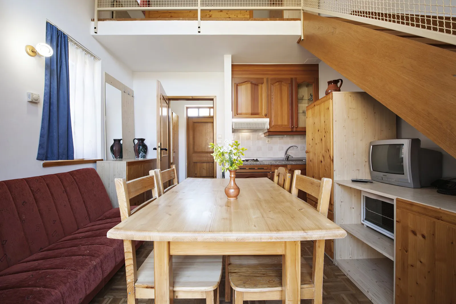 Geräumiges und gemütliches Appartement für drei Personen mit einem Doppelbett in der Größe 200 x 160 cm in der oberen Etage und einem Zusatzbett im Wohnraum, der sich im unteren Teil des Appartements befindet. Im Appartement (30,90 m²) befindet sich ein Badezimmer mit Dusche und WC, eine Kochnische und ein Esstisch im unteren Teil des Appartements. Dazu kommt noch eine Außenterrasse.