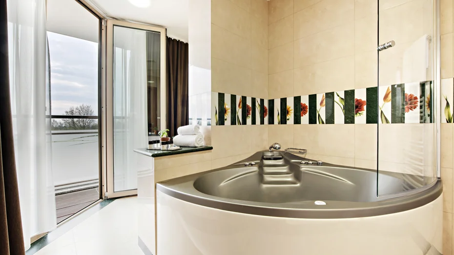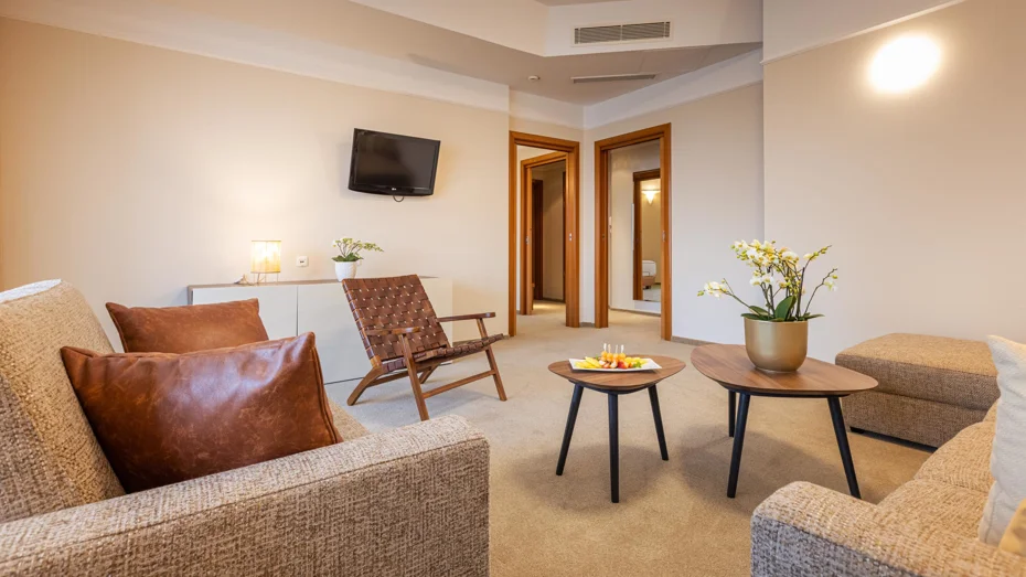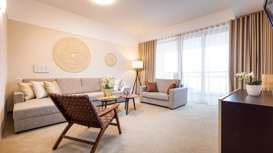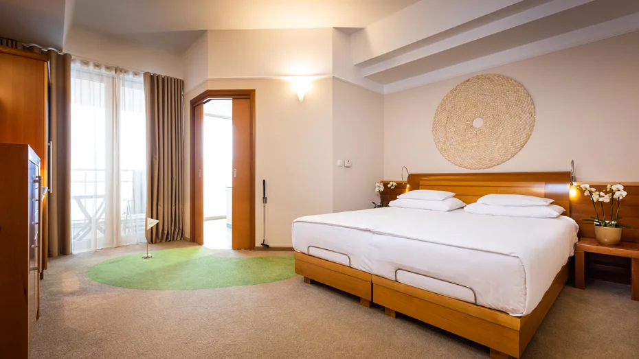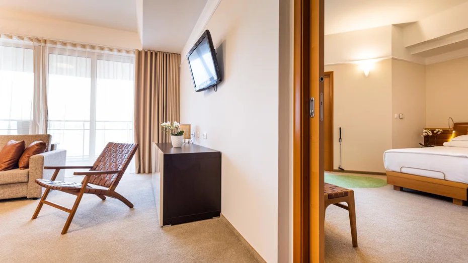 Elegante und gemütliche Suite mit zwei getrennten Räumen, einem Ehebett in der Größe 180 cm und einem Balkon mit ausgezeichneter Aussicht. Im Zimmer (57 - 65 m²) befindet sich ein Badezimmer mit Badewanne inklusive Thermal- und Normalwasser, eine getrennte Dusche mit WC, Schreibtisch und Sofa.