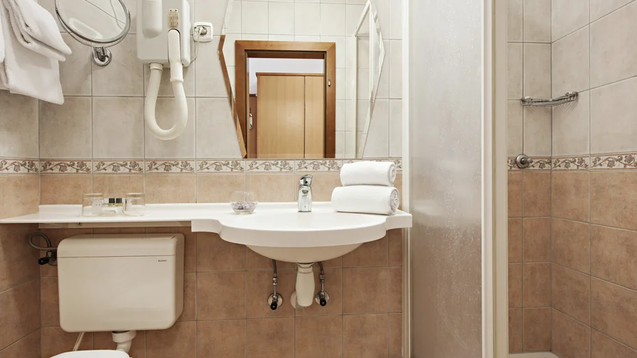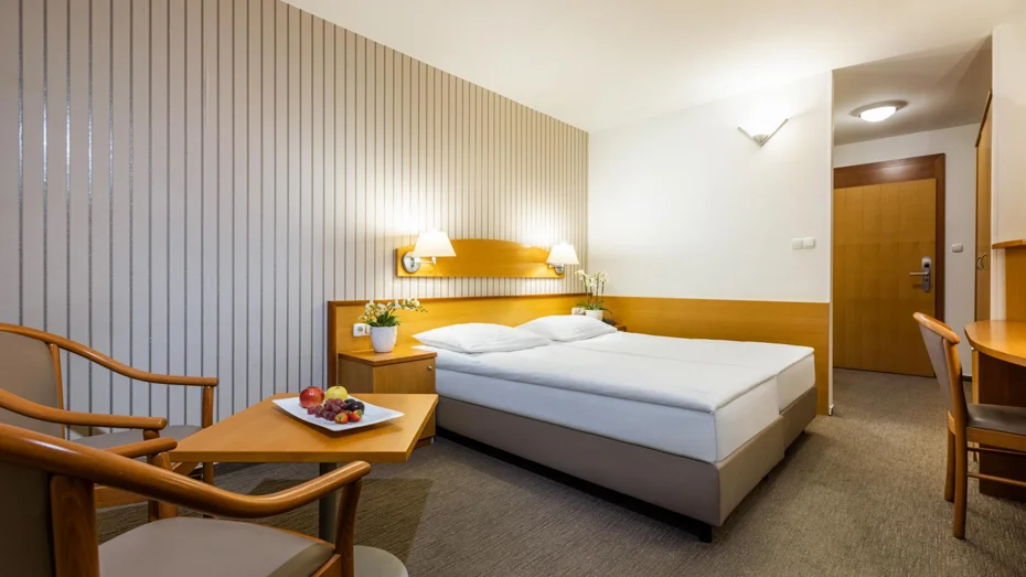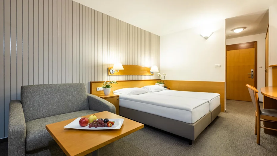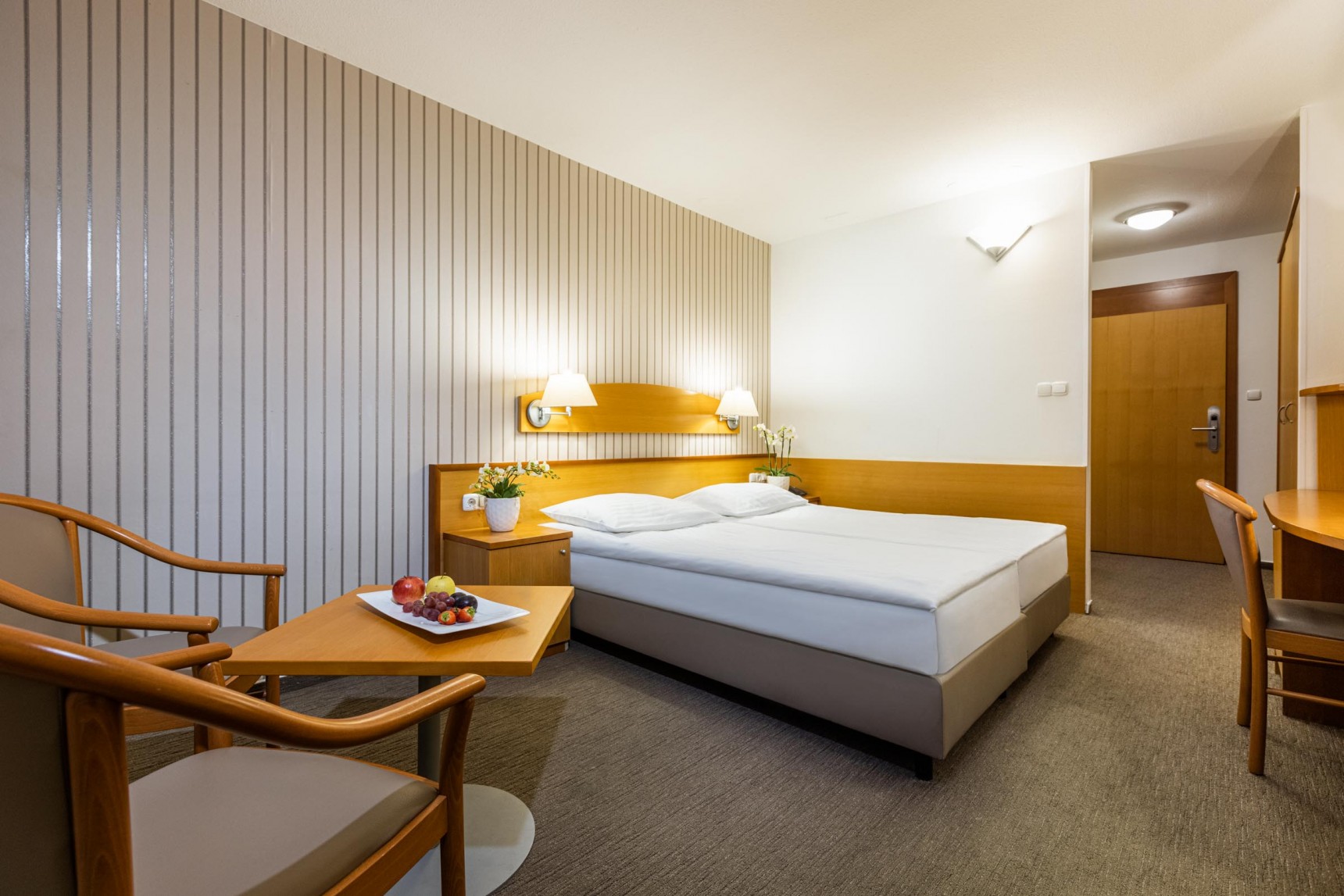 Gemütliches Doppelzimmer mit Doppelbett in der Größe 180 cm oder mit zwei getrennten Betten jeweils in der Größe 90 cm mit Parkblick. Im Zimmer (20 m²) befindet sich ein Badezimmer mit Badewanne und kombinierter Dusche und WC, ein Schreibtisch und Zweisitzer.