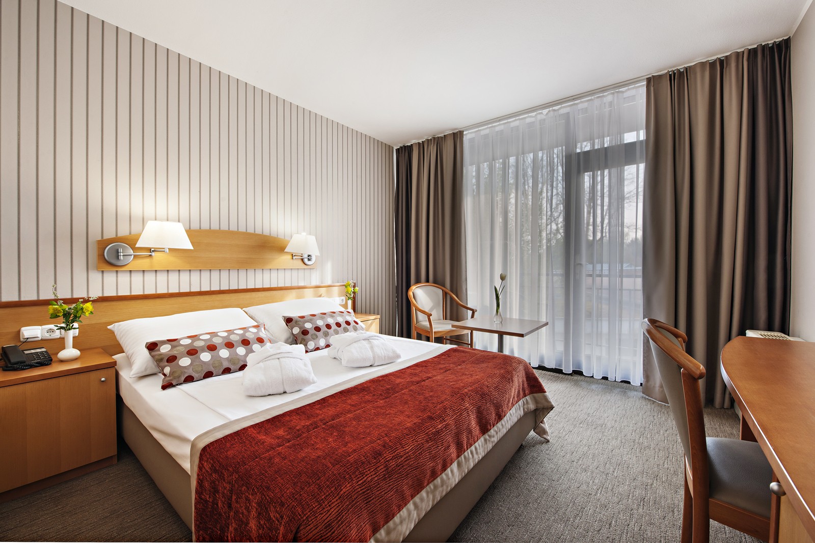 Economy Zimmer ( 14,5 m2 )mit französischem Bett in der Größe 140 cm. Im Zimmer befindet sich ein Badezimmer mit Dusche und WC, ein Schreibtisch und Einsitzer.