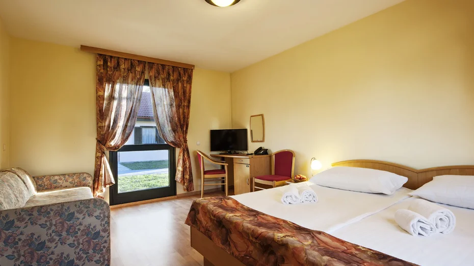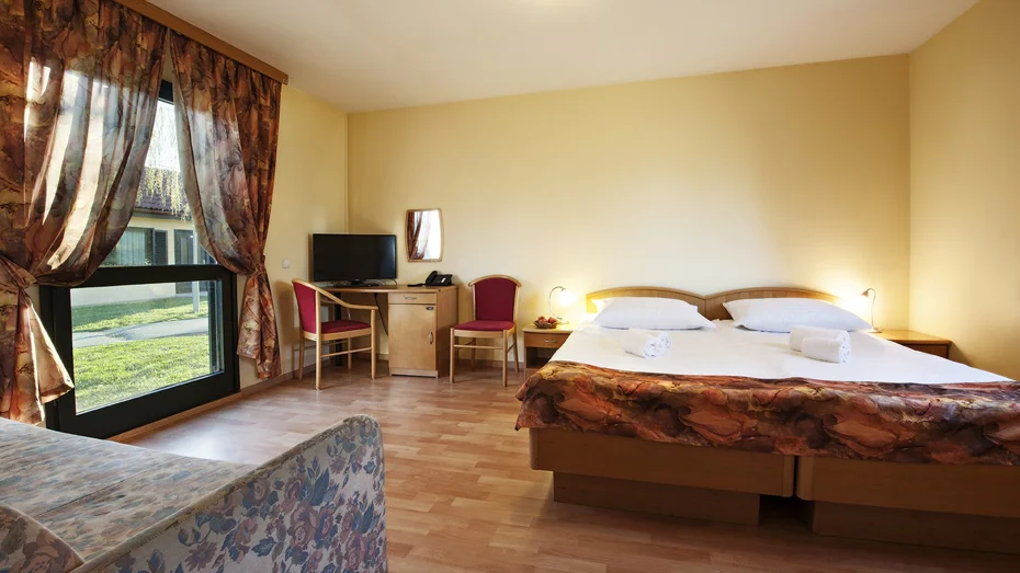 Gemütlicher Bungalow für zwei Personen mit Doppelbett der Größe 180 cm oder zwei getrennten Betten jeweils der Größe 90 cm und mit Parkblick. Im Bungalow mit einer Größe von 28 m2 befindet sich ein Badezimmer mit Dusche und WC, eine Terrasse, ein Schreibtisch und Einsitzer. Zusatzbett auf Anfrage möglich.