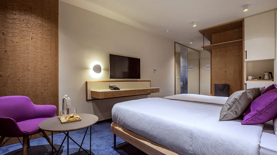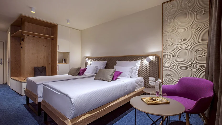 Comfortable double room with a balcony with a view of the lake. The room (20 m2) features two 90 cm wide beds or a single 180 cm wide bed, a desk, free WIFI and bathroom with shower and toilet.