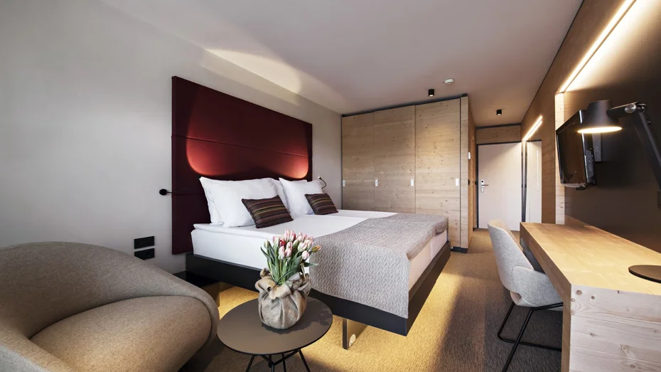 Renovated, spacious double room with balcony and lake view. The 22-26 m2 room with twin beds 90 cm wide or a double bed 180 cm wide features a writing desk, a pull-out armchair (as an additional bed measuring 70 x 190 cm), a kettle for tea or coffee, free Wi-Fi access, and a bathroom with a bathtub or shower and toilet. All rooms were renovated in April 2017 using natural material from the neighbouring Slovenian towns.