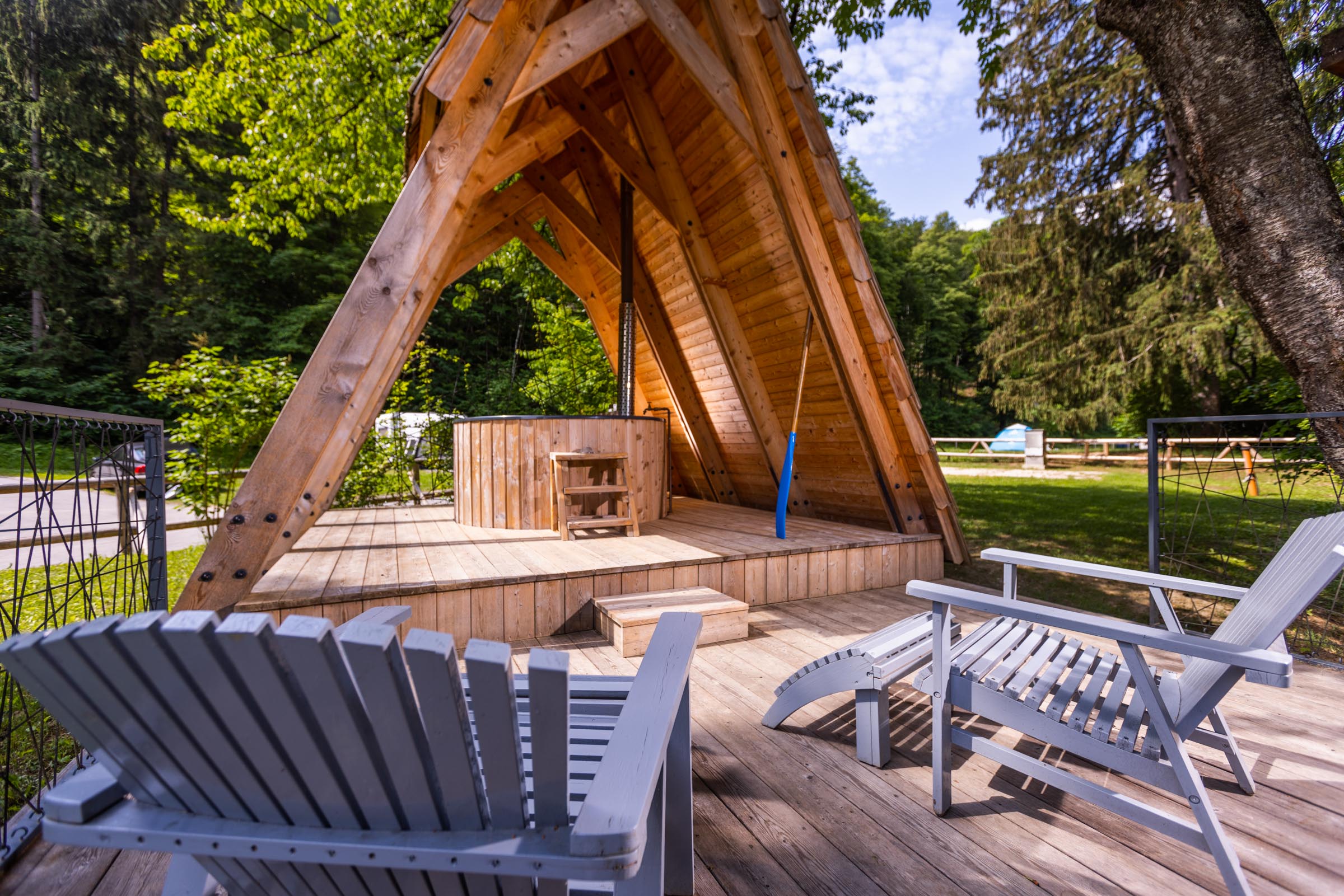 The size of the Premium Relax pitch approximately 300 square meters. There are electricty (220V/16A), water and drainage connections on the pitch. Premium Relax pitch is partly graveled. There is a covered wooden hot tub and terrace on the pitch. Wooden hot tub is prepared and cleaned by campsite maintenance staff. There is only one vehicle allowed on the pitch. Maksimum two pets are allowed to stay on the pitch.