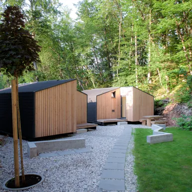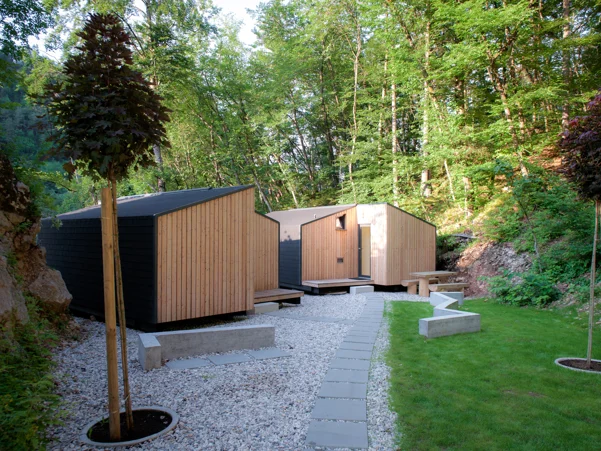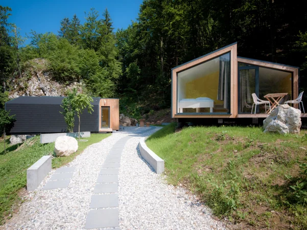 Family mobile homes with a contemporary and highly aesthetic design, situated at the edge of the forest, bring joy and happiness to parents and children alike. They are slightly elevated above the surrounding area and offer magnificent views, while providing guests with complete privacy and comfort. The houses are made of wood and natural materials that breathe. A large panoramic window gives a feeling of spaciousness and connection with the surrounding nature. The houses are surrounded by greenery and offer pleasant shade during the summer months, as well as views that are sure to amaze.