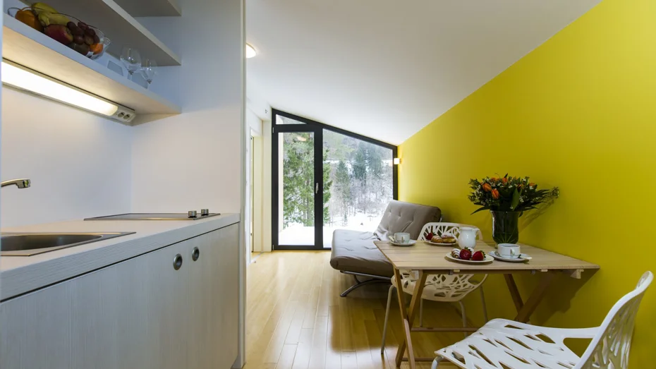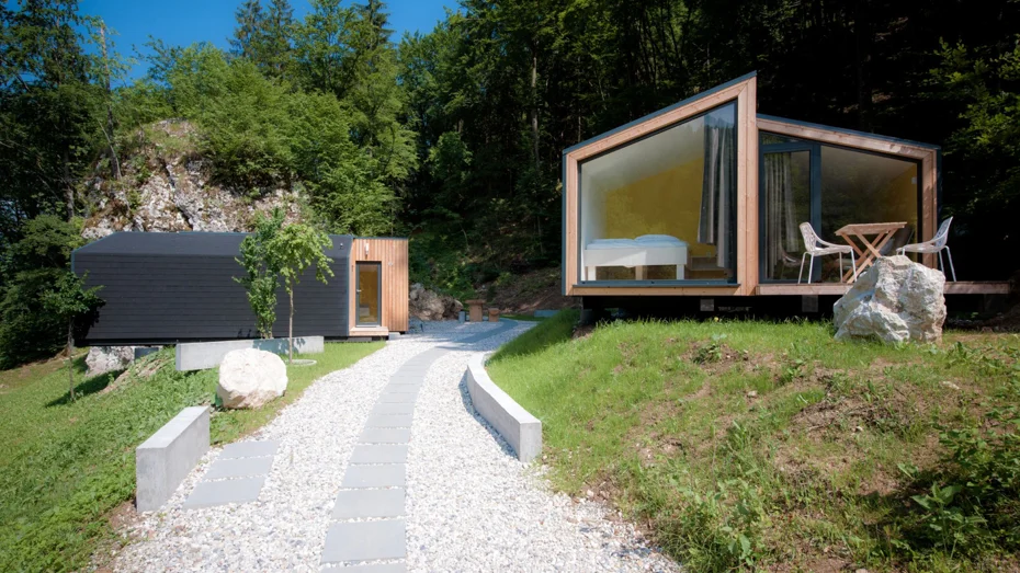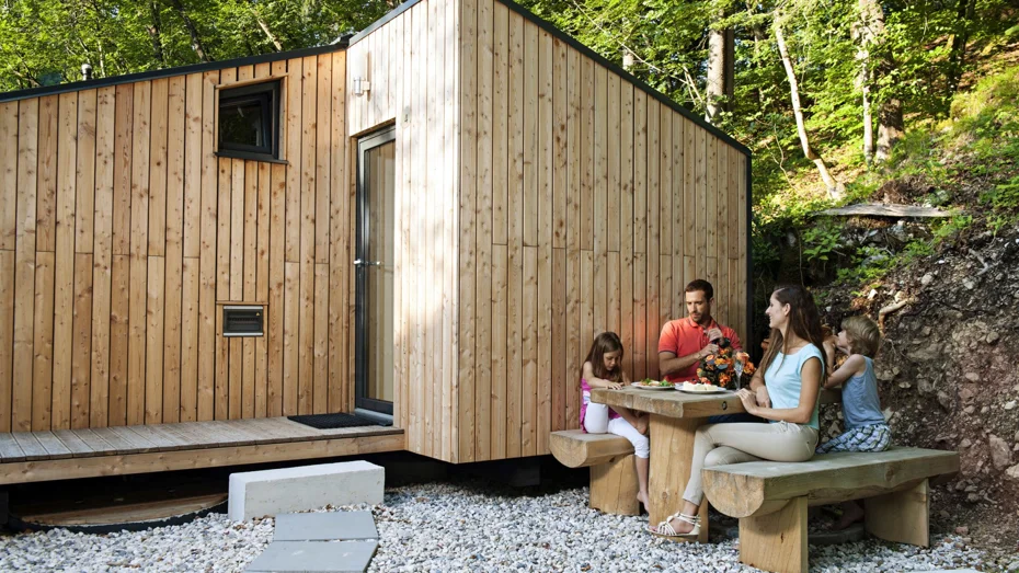 Family mobile homes with a contemporary and highly aesthetic design, situated at the edge of the forest, bring joy and happiness to parents and children alike. They are slightly elevated above the surrounding area and offer magnificent views, while providing guests with complete privacy and comfort. The houses are made of wood and natural materials that breathe. A large panoramic window gives a feeling of spaciousness and connection with the surrounding nature. The houses are surrounded by greenery and offer pleasant shade during the summer months, as well as views that are sure to amaze.