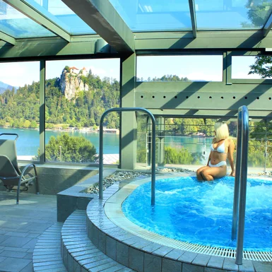 Waterpark Wellness Živa at the Rikli Balance Hotel comprises six pools and an indoor slide with a view of Lake Bled. Young and old swimmers alike will be impressed by the pool panorama. Parents can also relax in the hot tub or using our wellness services.