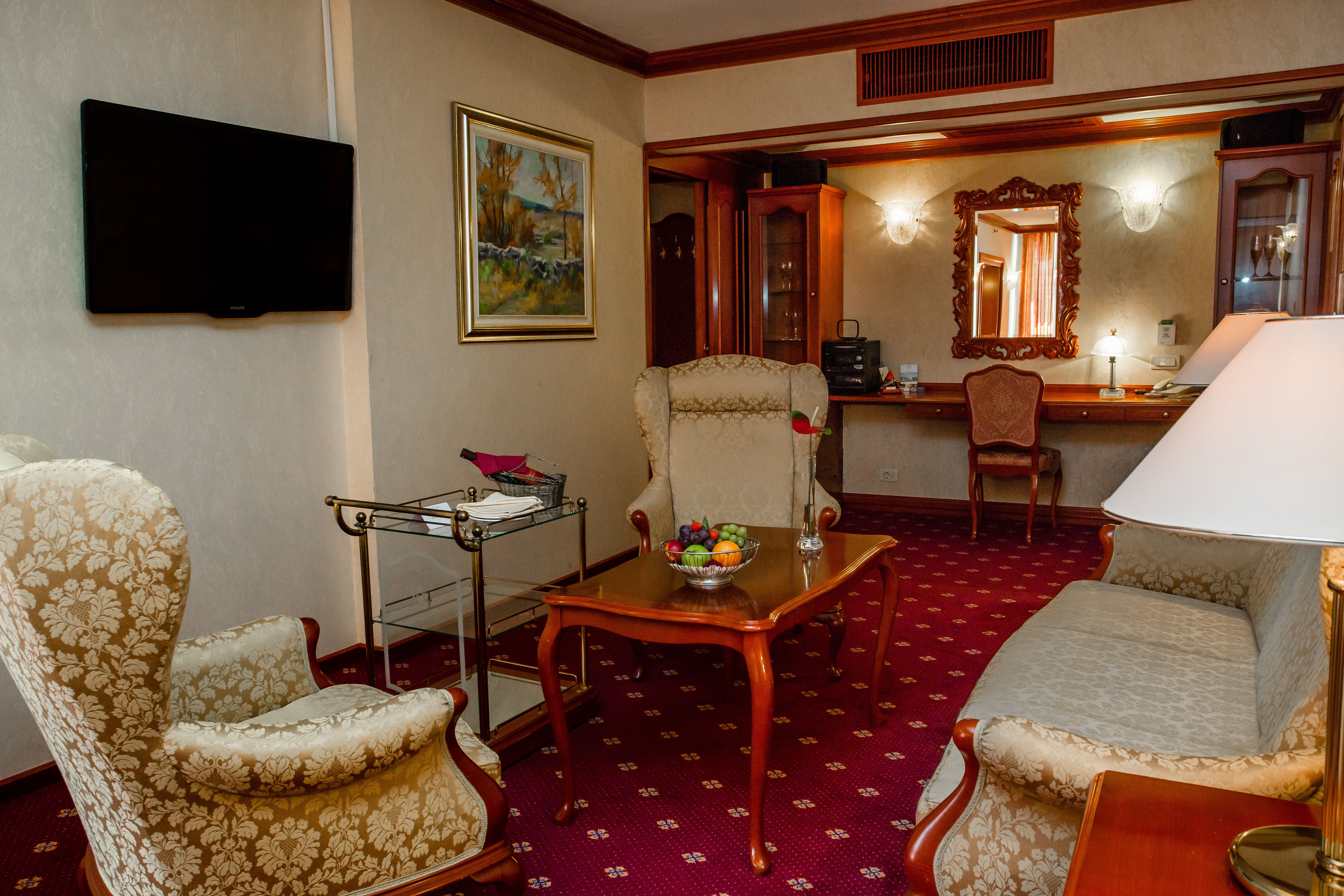 Suite facilities: bedroom, hall, living room, balcony, safe, writing desk, mini bar, satellite TV, radio, telephone, cable internet, bathroom with spa bath, hairdryer, pack toiletries, bathrobe, slippers, Wake up service / alarm clock, 24-hour room service. Room size: 73 m2 Bed size: 1 double bed 210 x 200 cm + 2x sofa bed 140 x 190 cm