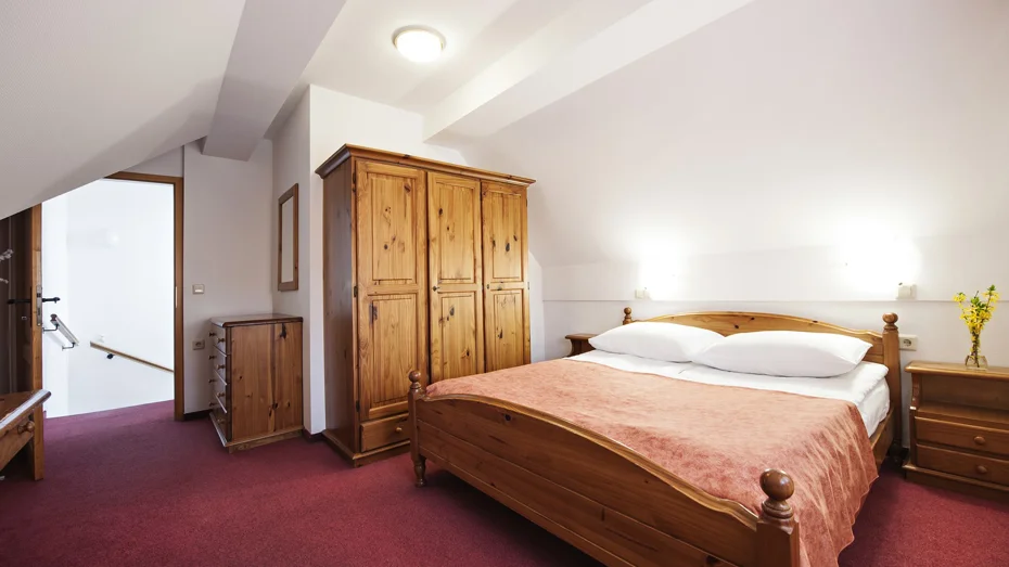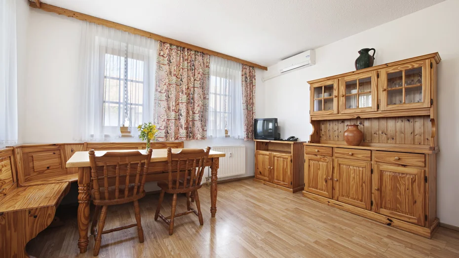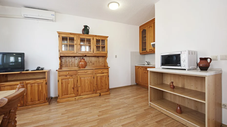 A spacious and comfortable apartment for four people, with one bedroom with a king size bed (200 x 160 cm) and another room with a double bed on the upper floor. The apartment (70 m2) features a bathroom with shower and toilet, a dining table and a kitchenette on the lower floor as well as a terrace.