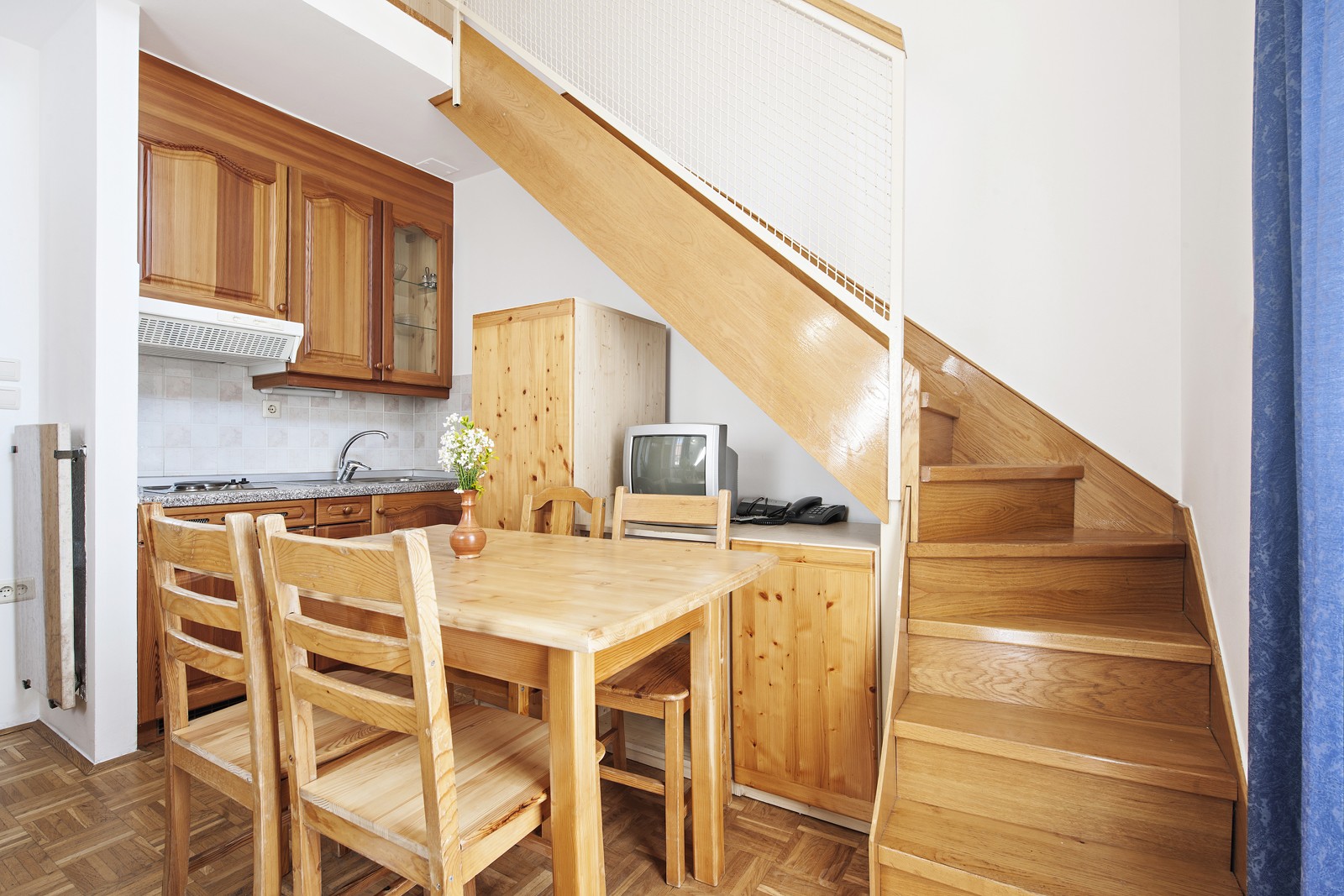 A spacious and comfortable apartment for three people, with a queen-size bed (200 x 160 cm) on the upper floor and an additional bed in the living room on the lower floor. The apartment (30.9 m2) features a bathroom with shower and toilet, a kitchenette and a dining table on the lower floor as well as a terrace.