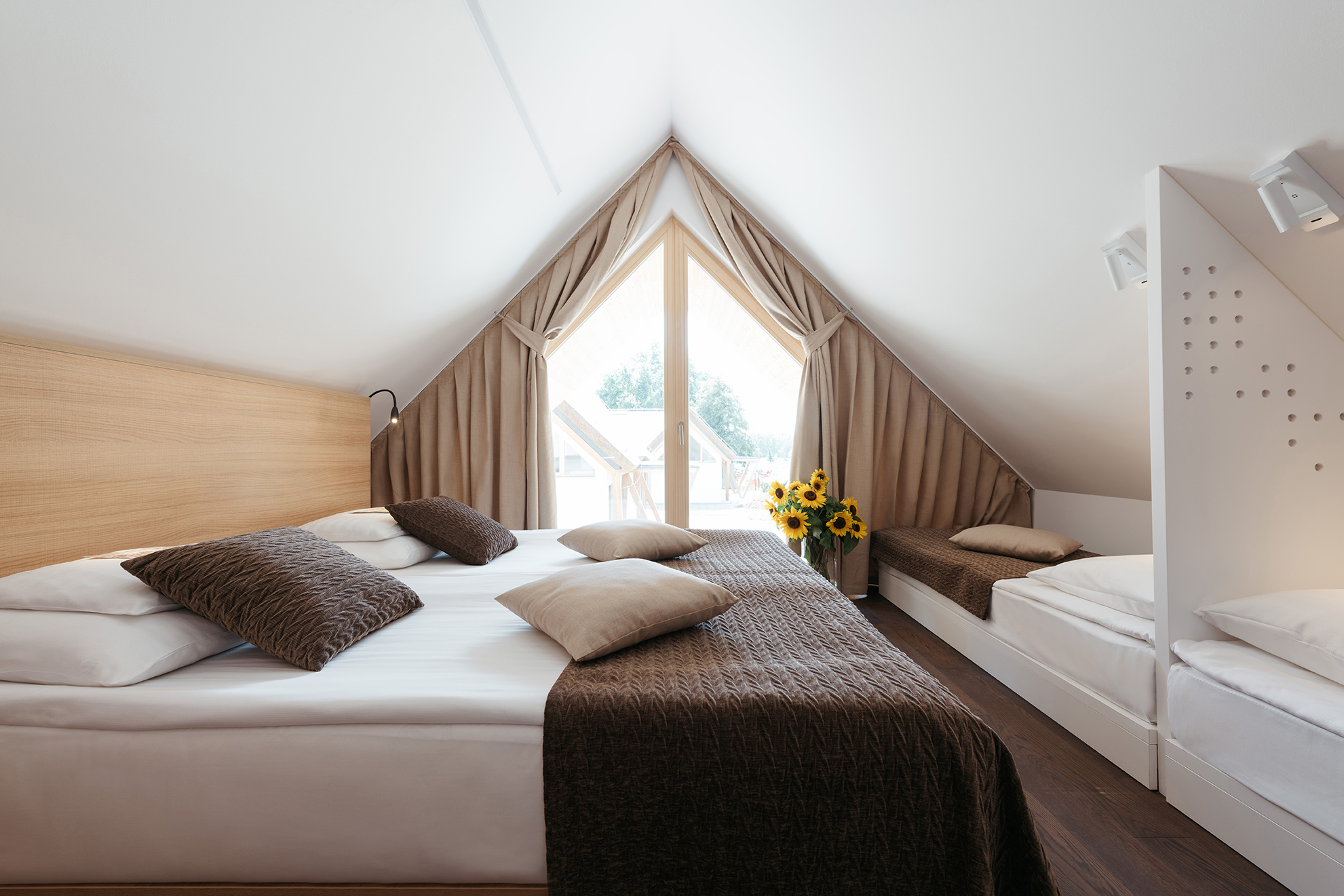 Welcome to the comfortable holiday houses of Prekmurska vas Ajda, which were inspired by traditional Prekmurje houses called “cimprače”. The new, bright houses are roofed with reeds, and the pillows in the sleeping area are filled with buckwheat hulls. Use the living room and terrace on the ground floor for socialising, or order a picnic basket containing typical local dishes from the hotel restaurant. Surrender to the harmony that awaits you in Prekmurska vas Ajda!