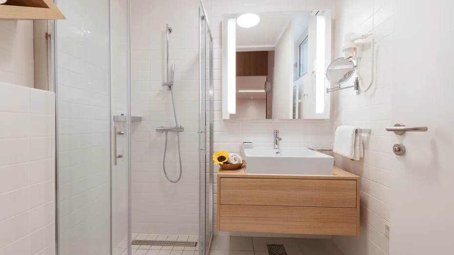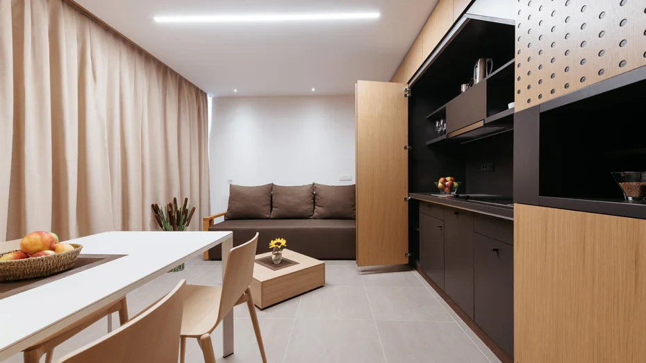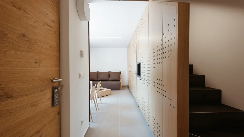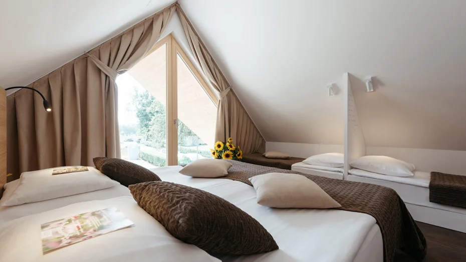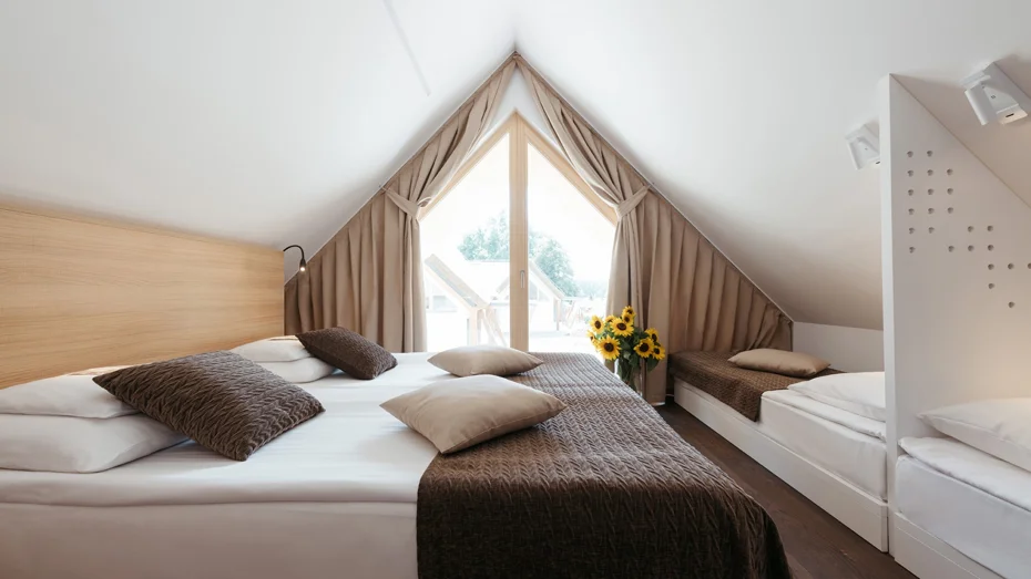 A four-person house (38.3 m2) with a 180 cm wide bed and two 90 cm wide beds on the upper floor and an extendable three seater sofa, sized 160 x 200 cm, on the ground floor. The house includes a bathroom with a shower and a toilet, a dining table, an extendable three seater sofa and a kitchen with a stove, a refrigerator, a sink, a dishwasher and tableware for 4 people. A terrace has been arranged in front of the house.