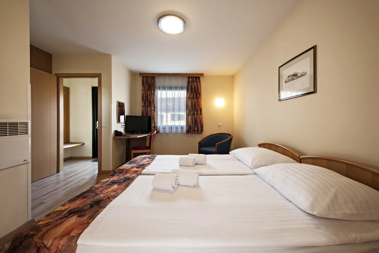 Comfortable bungalow for two people with a double bed 180 cm wide or twin beds 90 cm wide and park view. The 23 m2 bungalow features a bathroom with shower and toilet, a terrace, a writing desk and an armchair.