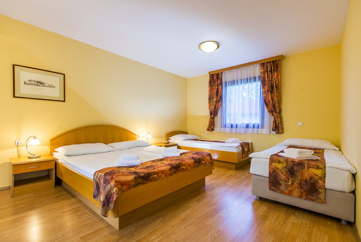 A comfortable 40 m2 bungalow with king size bed (width 180 cm) or two twin beds (width 90 cm). The room is furnished with a table, a sofa and offers a terrace with park view and ensuite bathroom with shower.