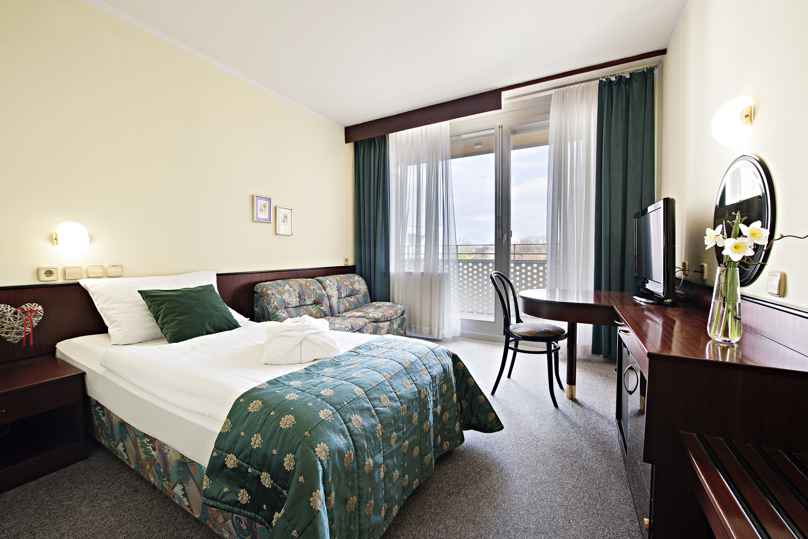 Comfortable single room with a queen-size bed (140 cm wide) and park view. The 16.5 m2 room features a bathroom with shower and toilet, a writing desk.
