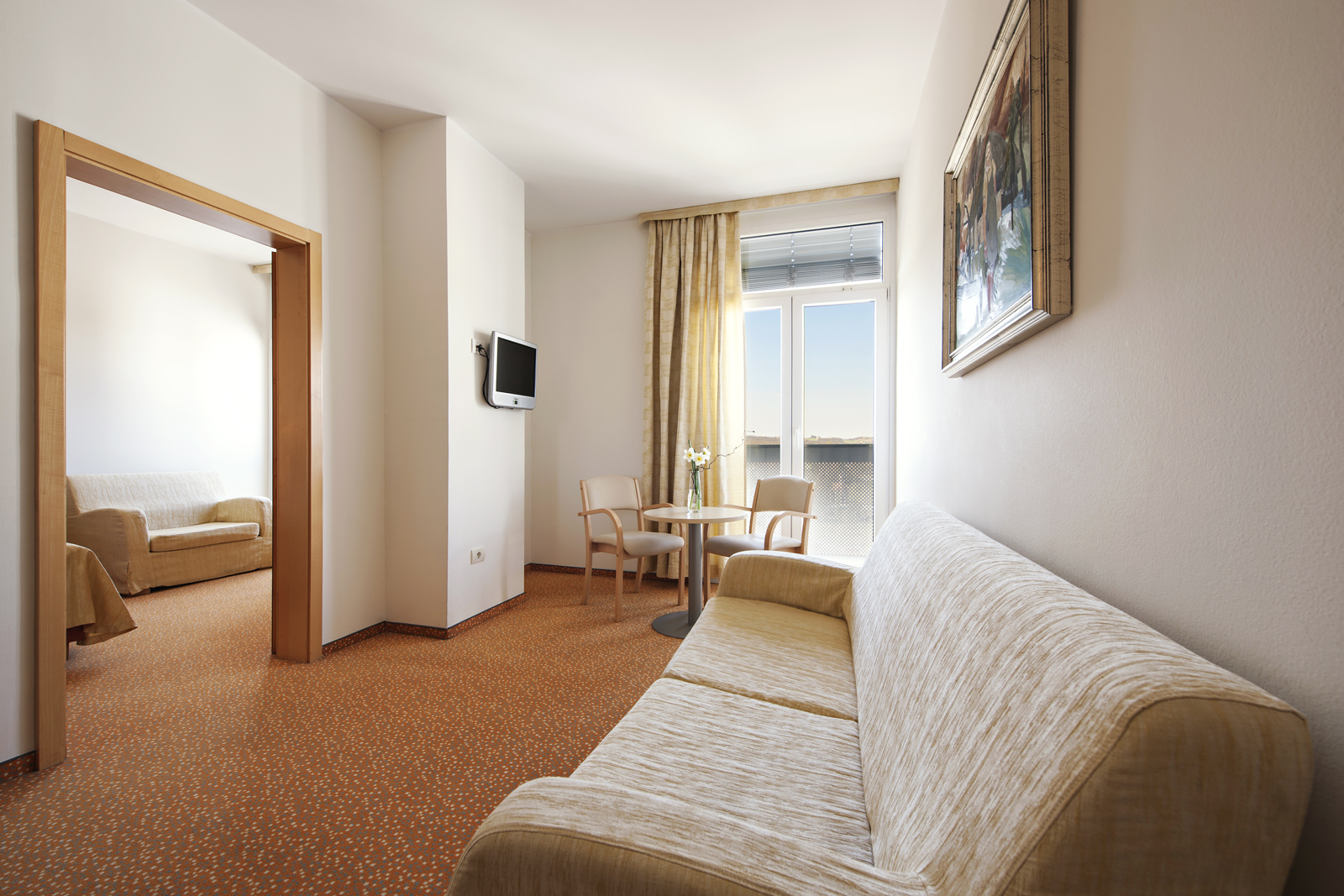 Comfortable suite with a 160 cm wide bed or two separate 80 cm wide beds and french balcony with a view of the park. The room (44,20 m2) features a bathroom with shower and toilet as well as a desk and chair.