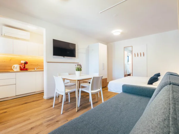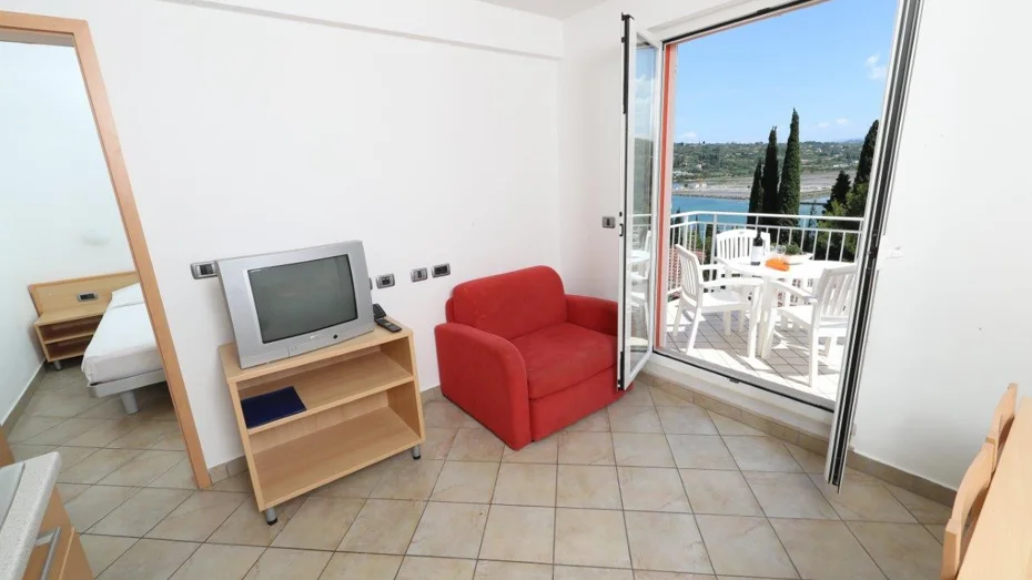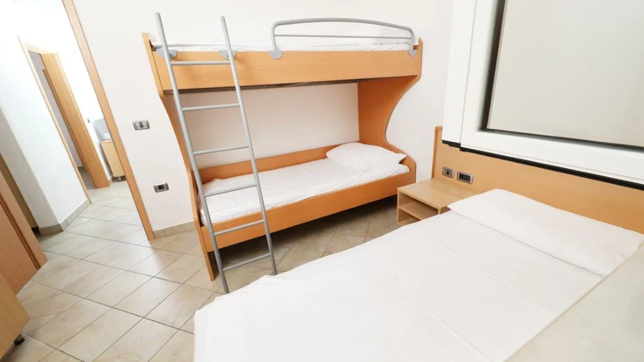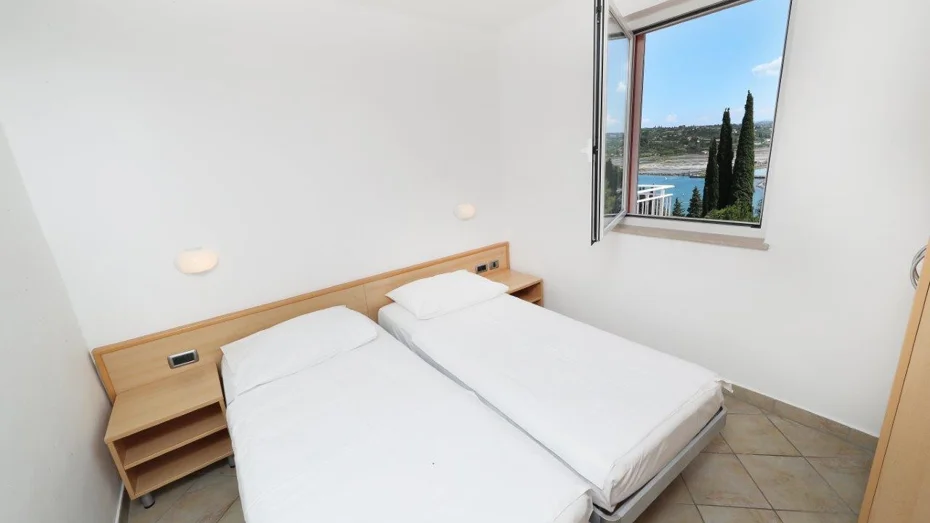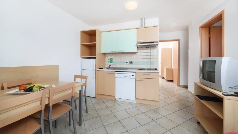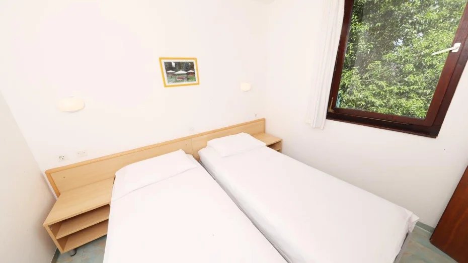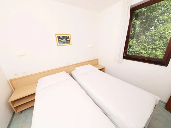 Apartman je opremljen: električnim štednjakom, hladnjakom, kuhinjskim priborom, SAT televizijom i telefonom, sušilom za kosu, opcijom klima uređaja. Apartman se sastoji od: 2 odvojene spavaće sobe + dnevnog boravka s 3 ili 4 kreveta, spavaće sobe s bračnim krevetom, kuhinjskog kutka, kupaonice s tušem, terase ili balkona. Veličina apartmana: 42 m2 Veličina kreveta: 2 kreveta (twin) 90 x 200 cm + pomoćni krevet 80 x 180 cm