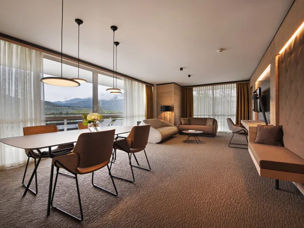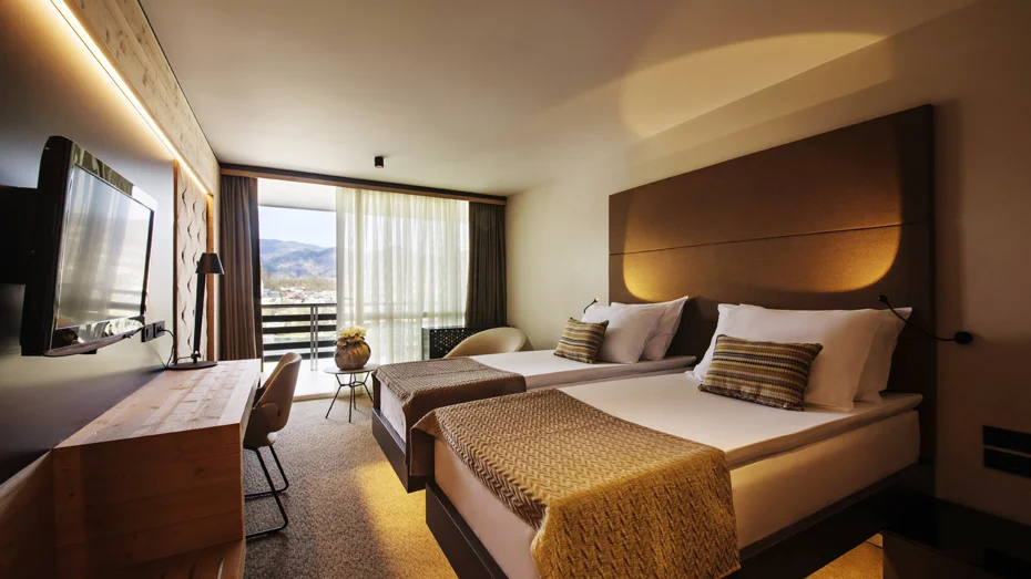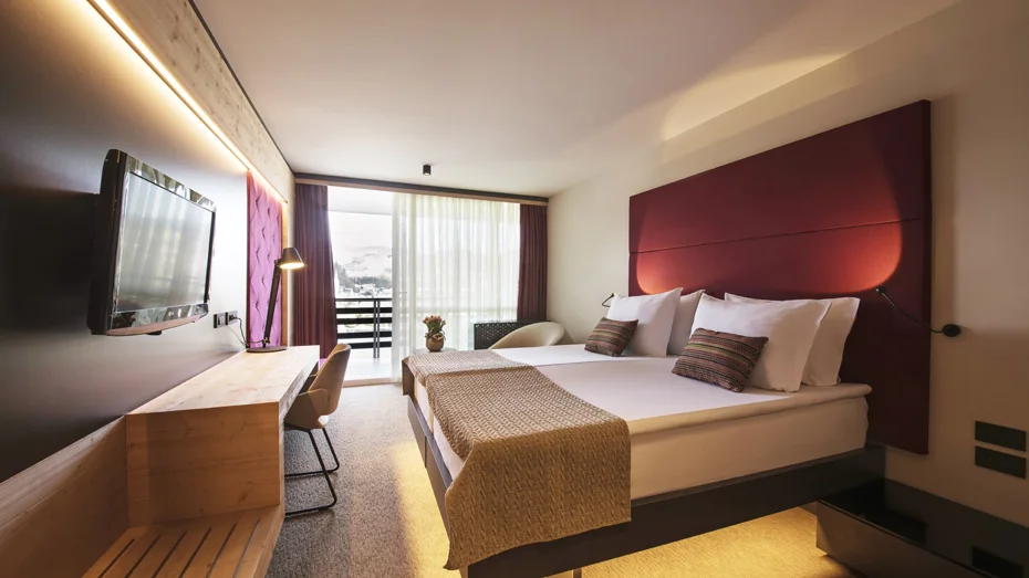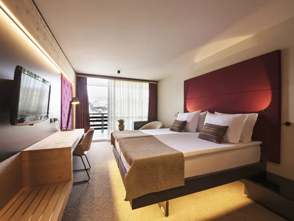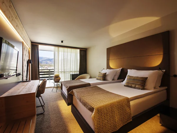 Obnovljena prostrana dvokrevetna soba s balkonom i pogledom na park. U sobi veličine 22-26 m2 s dva ležaja širine 90 cm ili jednim ležajem širine 180 cm nalazi se pisaći stol, fotelja na izvlačenje (kao pomoćni ležaj veličine 70 x 190 cm), grijač za pripremu čaja ili kave, besplatni Wi-Fi, kupaonica s kadom ili tušem i WC. Sve sobe obnovljene su u travnju 2017. uporabom prirodnih materijala iz obližnjih slovenskih mjesta.