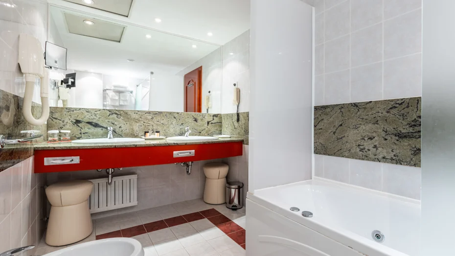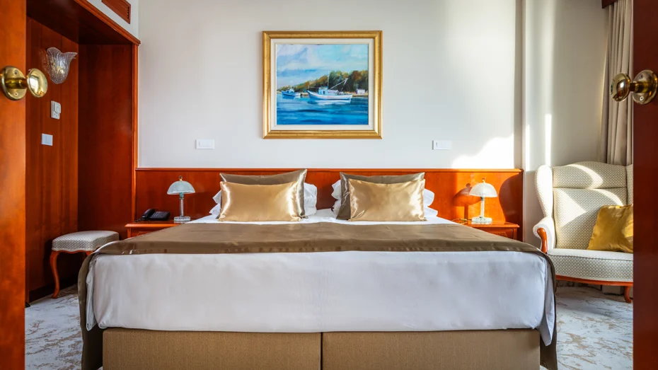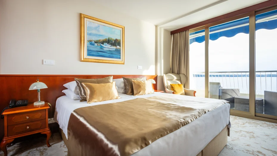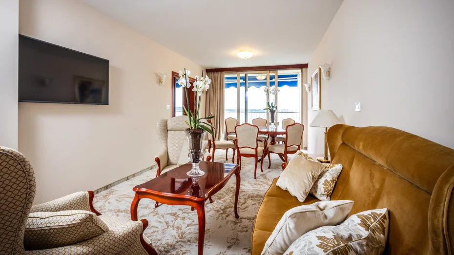 Sadržaji apartmana: spavaća soba, hodnik, dnevna soba, balkon, sef, radni stol, minibar, satelitska televizija, radio, telefon, kabelski internet, kupaonica s hidromasažnom kadom, sušilo za kosu, set toaletnih potrepština, ogrtač, papuče, usluga buđenja / alarm, 24-satna usluga posluge u sobi. Veličina sobe: 64 m2 Veličina kreveta: 1 bračni krevet 180 x 200 cm + pomoćni krevet 140 x 200 cm