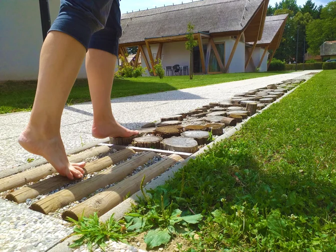 Izujte se i prošećite stazom za bosonoge koja se sastoji od šest različitih podloga iz prekmurske prirode, svaka sa svojim blagotvornim učinkom. A u parku pronađite svoje omiljeno drvo i zagrlite ga. Drveće je izvor životne energije i pozitivno utječe na raspoloženje, umiruje i puni energijom.