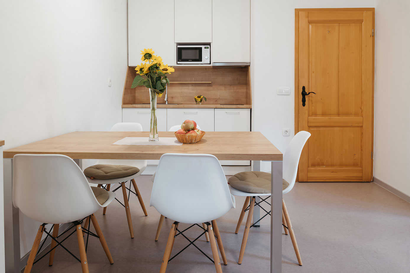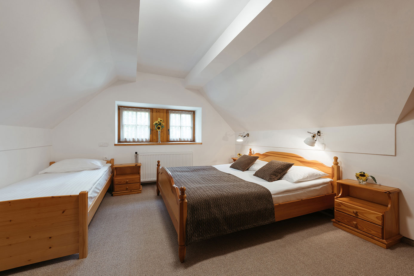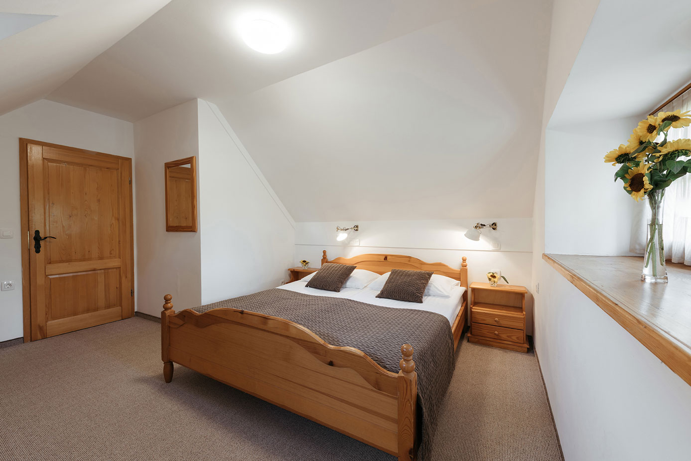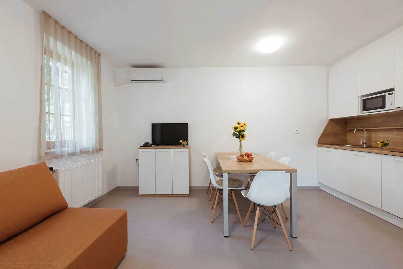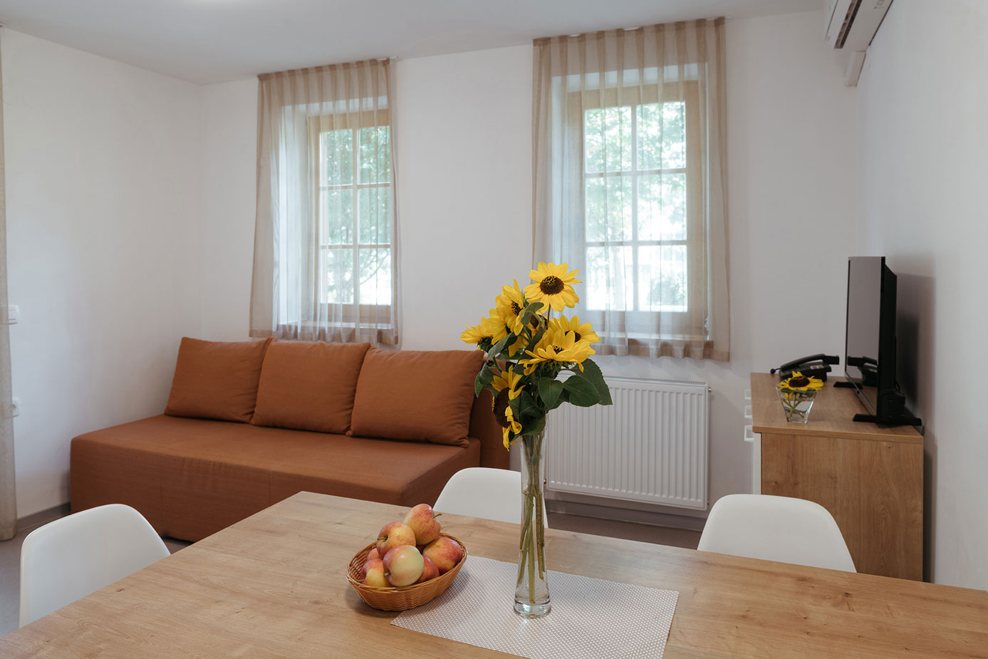 Prostran i udoban apartman za pet osoba s dvije spavaće sobe s francuskim ležajem 200 x 180 na gornjem katu. U jednoj spavaćoj sobi nalazi se i dodatni ležaj. U apartmanu (80 m2) se nalazi kupaonica s tušem i WC-om na gornjem katu. Na donjem katu nalaze se dnevni boravak s kuhinjskom nišom, WC i terasa.