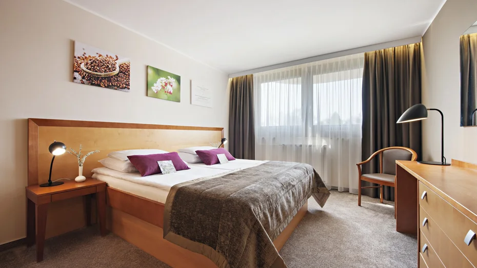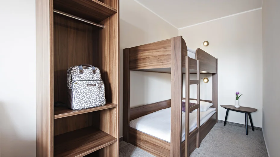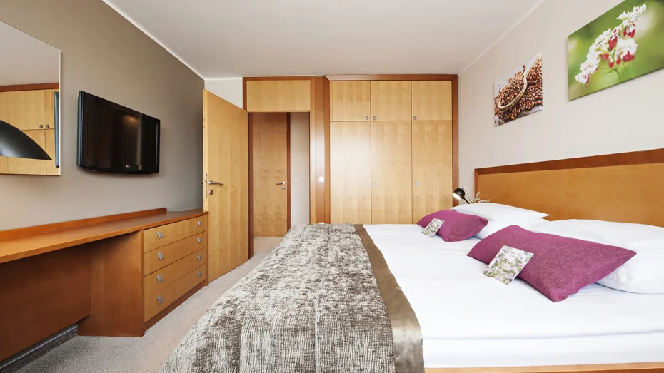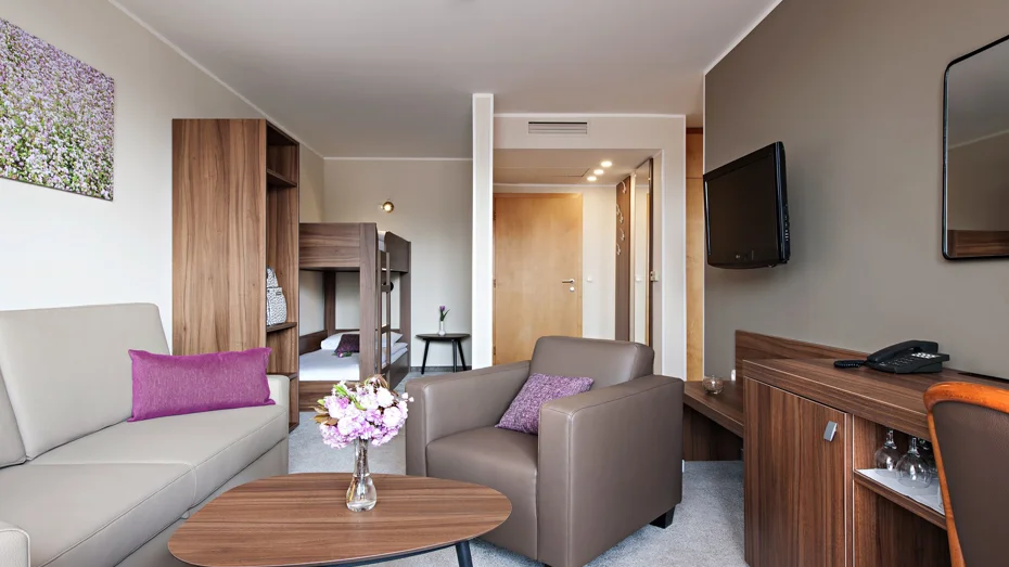 Udoban suite s bračnim ležajem (180 cm) i pogledom na park. U sobi veličine 50 m2 s dvije prostorije nalazi se kupaonica s tušem, odvojen WC, a u dnevnom boravku pisaći stol i trosjed i krevet na kat u sobnoj niši i terasa.