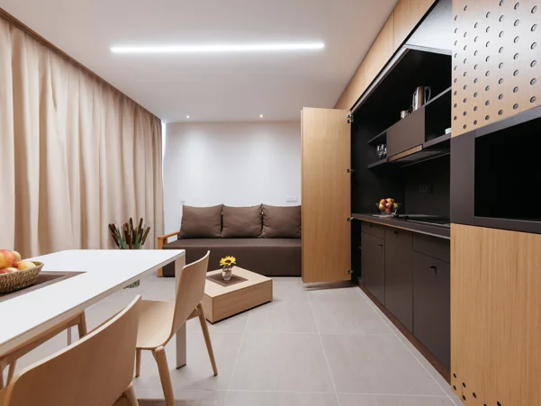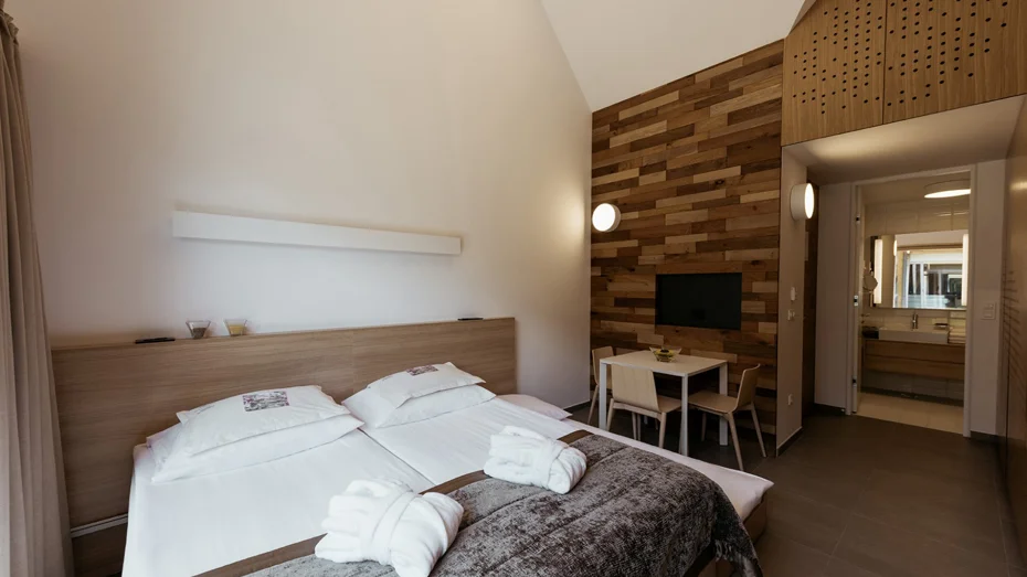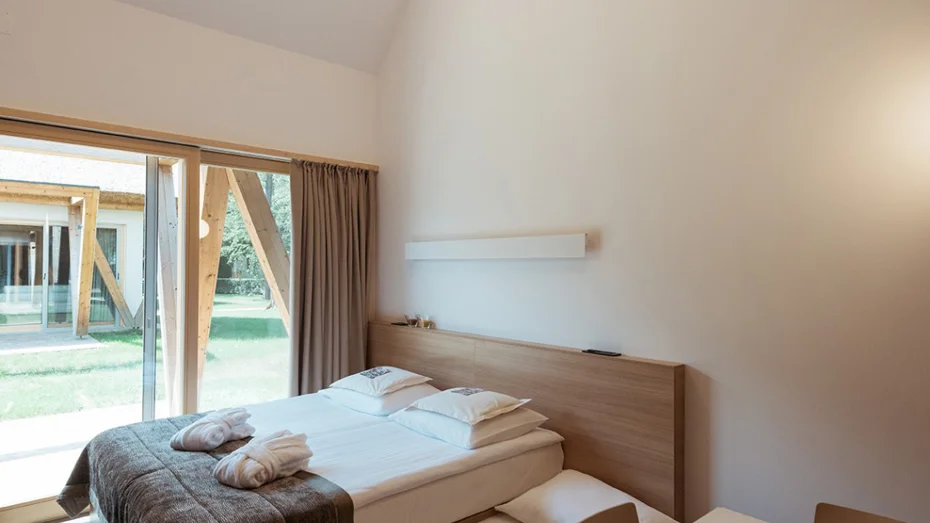 Prostrana i udobna kućica za tri osobe s ležajem širine 180 cm, francuskim ležajem širine 140 cm na gornjem katu te dodatnim ležajem širine 80 cm. U kućici (35,5 m2) je kupaonica s tušem i WC-om, pisaći i blagovaonički stol, dodatni ležaj i kuhinjska niša za pripremu toplih napitaka. Ispred kućice je i uređena terasa.