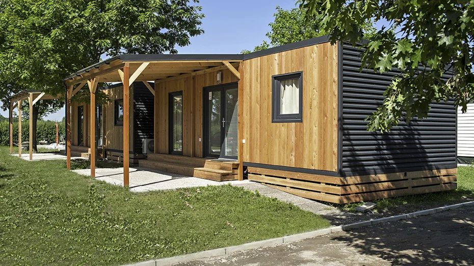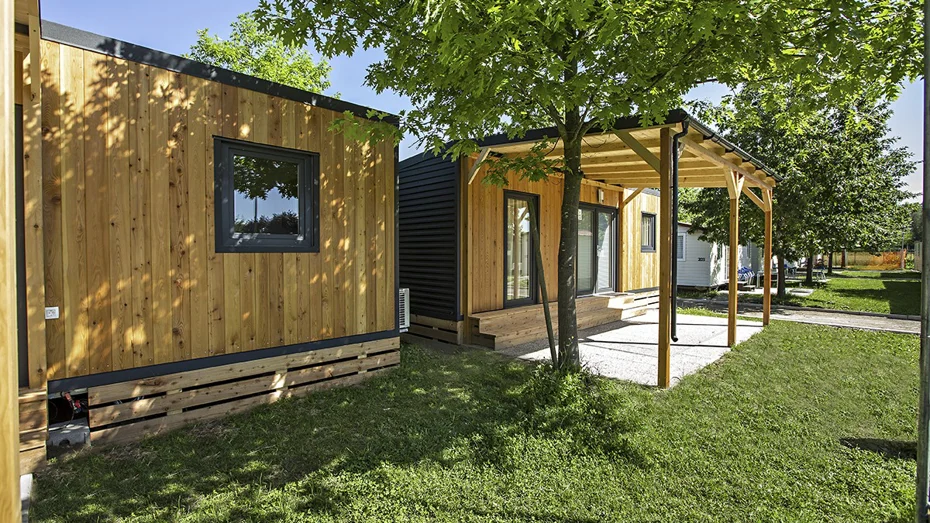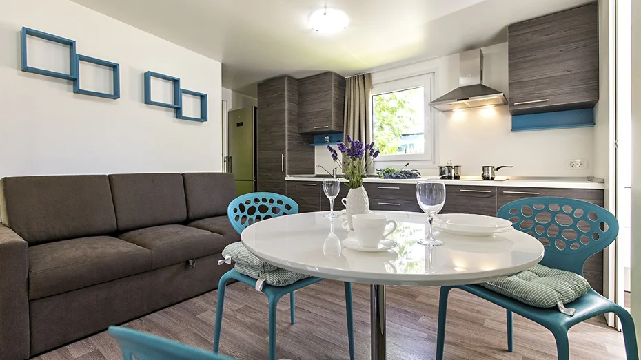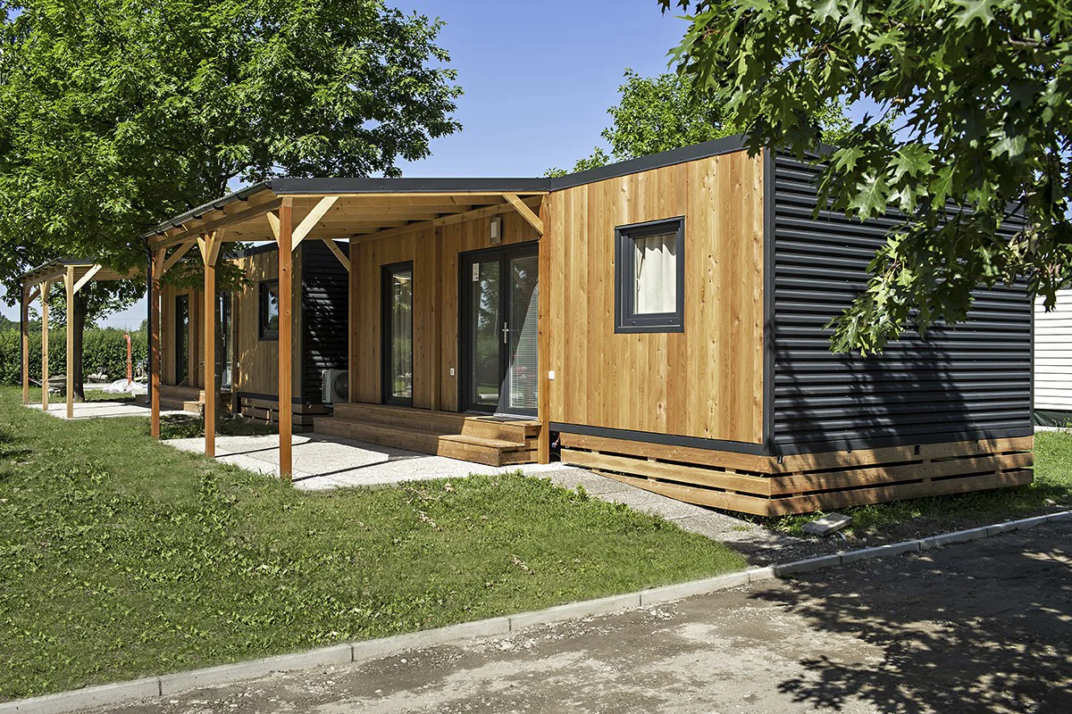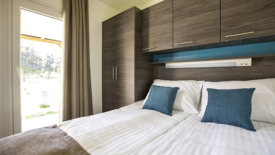 Udobna mobilna kućica za četiri osobe s francuskim ležajem (160 cm) i odvojenim ležajevima (90 cm) s pogledom na park. U kućici veličine 34 m2 nalazi se kupaonica s tušem i WC-om, terasa, blagovaonički stol, dvosjed i kuhinjska niša.