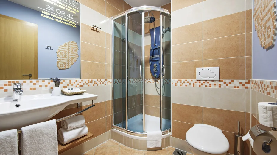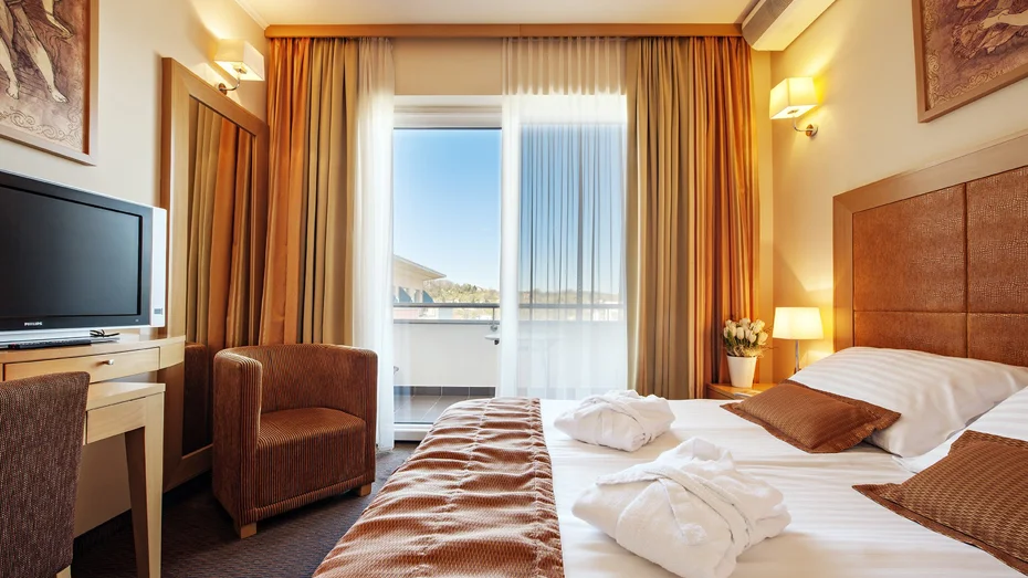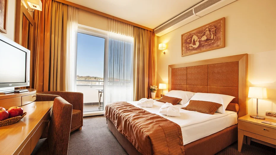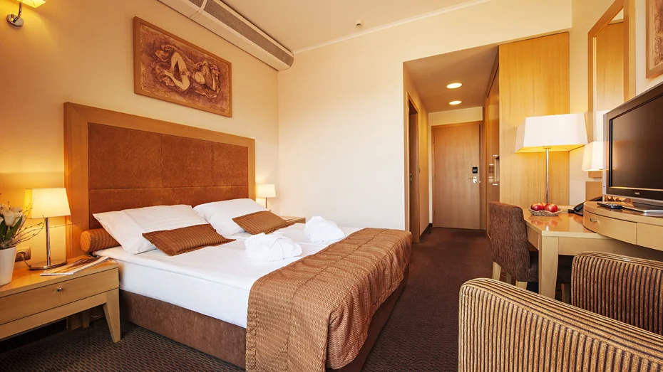 Elegantna i udobna dvokrevetna soba s francuskim ležajem širine 160 cm i balkonom. U sobi (20 m2) se nalaze kupaonica s tušem i WC-om, pisaći stol i stol.
