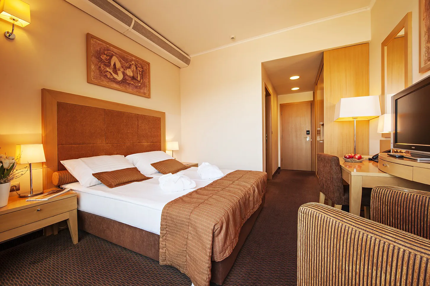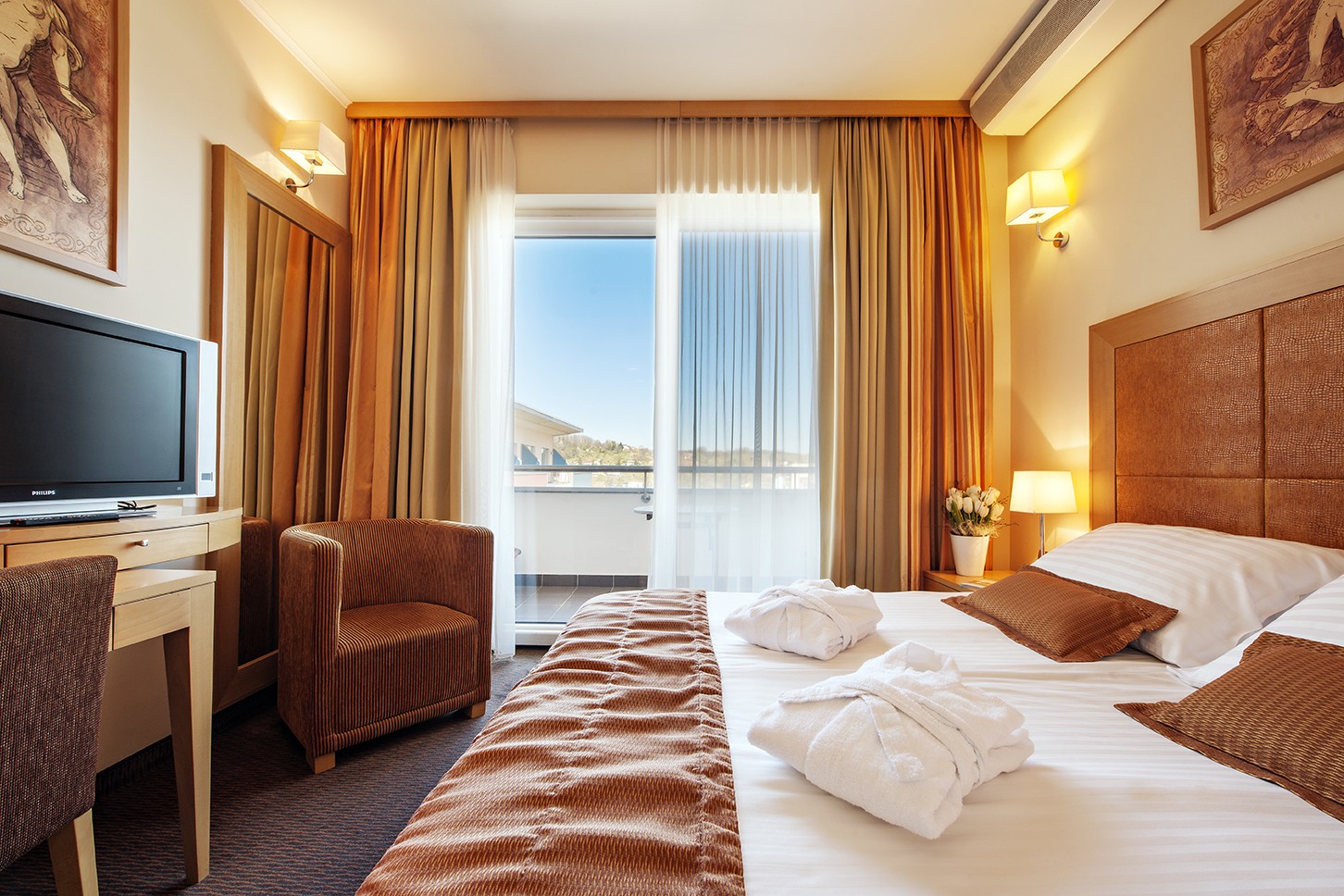 Elegantna i udobna dvokrevetna soba s francuskim ležajem širine 160 cm i balkonom. U sobi (20 m2) se nalaze kupaonica s tušem i WC-om, pisaći stol i stol.