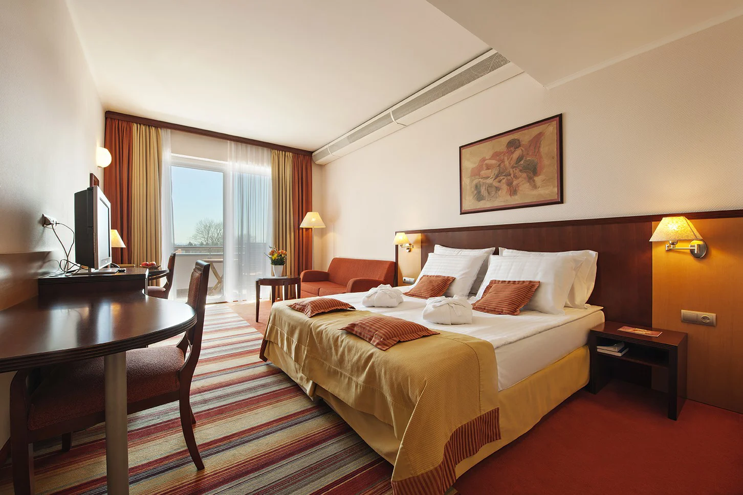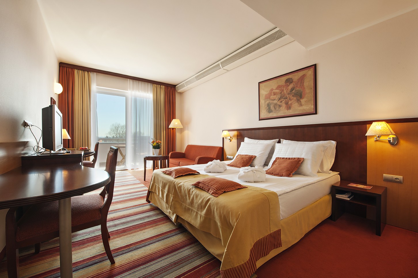 Elegantan i udoban suite s ležajem širine 180 cm ili odvojenim ležajevima širine 90 cm i balkonom. U suiteu (33 m2) se nalaze kupaonica s kutnom kadom i WC-om, pisaći stol i kauč.