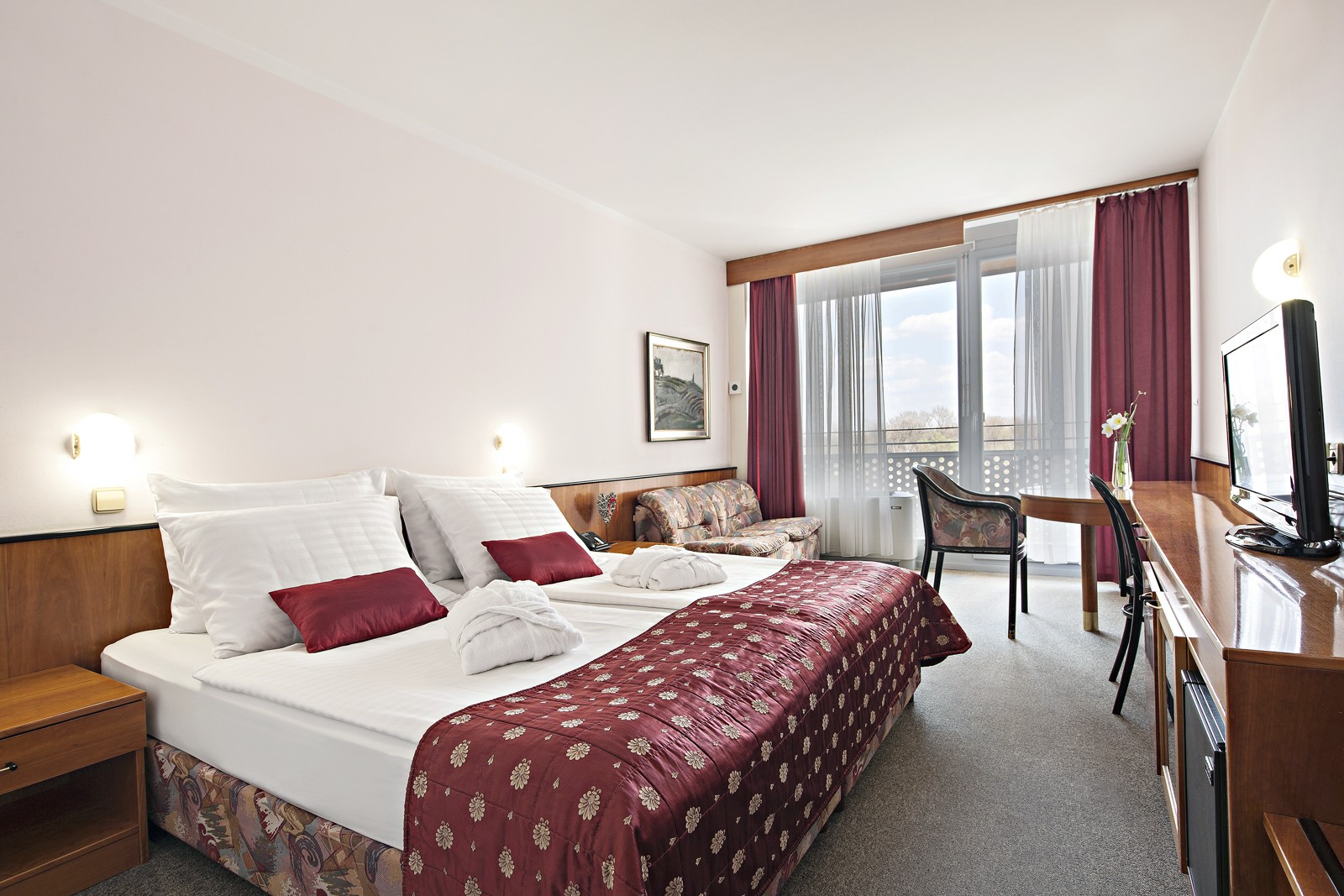 Udobna dvokrevetna soba s ležajem širine 180 cm ili odvojenim ležajevima širine 90 cm. U sobi veličine 23,5 m2 nalazi se kupaonica s kadom i WC-om, pisaći stol i jednosjed.