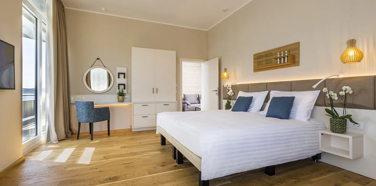 Tutti i resort della costa slovena - Bernardin, San Simon e Salinera - si distinguono per la loro posizione unica, a un solo passo dal mare, da dove potrete ascoltare i suoni naturali del mare comodamente dal vostro letto, che rilassano la mente e permettono ai sogni di vagare liberi durante la notte. Che cosa c’è di più bello che essere svegliati la mattina dal rumore delle dolci onde del mare e dal chiacchiericcio dei gabbiani? Il sonno ristoratore e un risveglio tranquillo nel comfort delle camere rinnovate del Grand Hotel Bernardin a Portorose, dell’Hotel Haliaetum e della dépendance Sirena a Isola avranno un effetto benefico sul rilassamento del corpo. Nel rinnovato Hotel Histrion a Portorose, oltre alla vista sul mare, rimarrete colpiti dal design speciale delle camere, dove la storia istriana - attraverso gli elementi del mare, della lavanda e degli ulivi - vi accoglie su ogni piano. È noto che la presenza del legno naturale negli spazi abitativi generalmente migliora il benessere, quindi il caldo abbraccio della quercia istriana nella camera vi ricorderà la forza di questo albero, da sempre presente in questa parte dell’Istria.