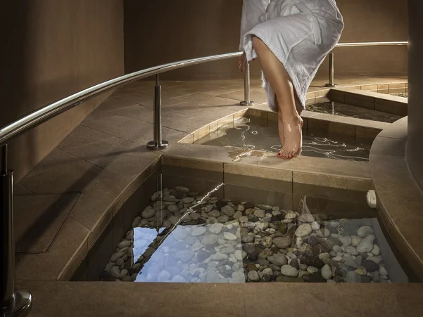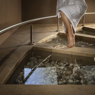 Ravviviamo il corpo stimolando i piedi, dove si nascondono molti punti riflessi, attraverso i quali equilibriamo il flusso energetico e allentiamo la tensione. Fate una passeggiata in quattro piccole piscine, dove ciascuna contiene pietre di diverse dimensioni e acqua alternata calda-fredda.