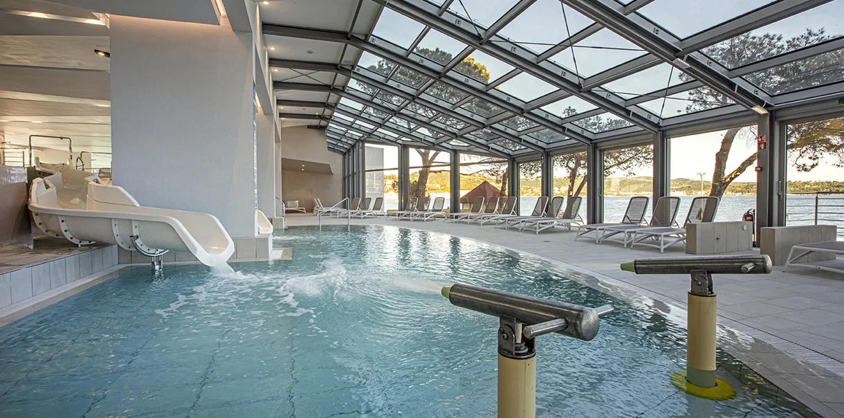 Nel ristrutturato Parco acquatico Termaris l’esperienza dell’acqua di mare nelle piscine è ancora più autentica, considerato che l’acqua proviene dalla zona che chiamiamo “acqua madre”. Infatti, contiene tantissimi microelementi che hanno un effetto benefico sul nostro corpo e sul nostro benessere. Ogni suo microelemento vi rafforzerà ulteriormente prima del prossimo inverno. Lo iodio migliora l’umore e ha un effetto benefico sul sistema cardiovascolare, il bromo ha un effetto benefico e calmante, il selenio agisce come antiossidante, il potassio presente nell’acqua aiuta a eliminare le tossine dall’organismo, il calcio accelera le funzioni neuromuscolari e il magnesio si prende cura del pelle e favorisce l’escrezione dell’acqua in eccesso. Oltre agli effetti benefici naturali sull’organismo, l’acqua di mare ha anche un effetto positivo sul miglioramento del benessere psicologico. E per questo motivo il Parco acquatico Termaris, che si estende su una superficie di ben 2.400 m², vi vizierà con piscine da nuoto, rilassanti e per bambini con scivoli e giochi acquatici, nonché con le viste più seducenti sul mare sloveno.