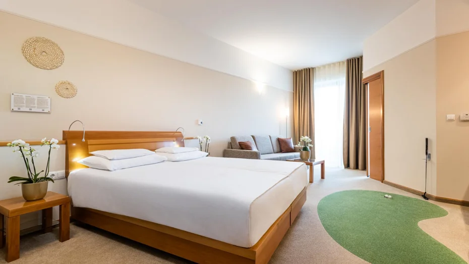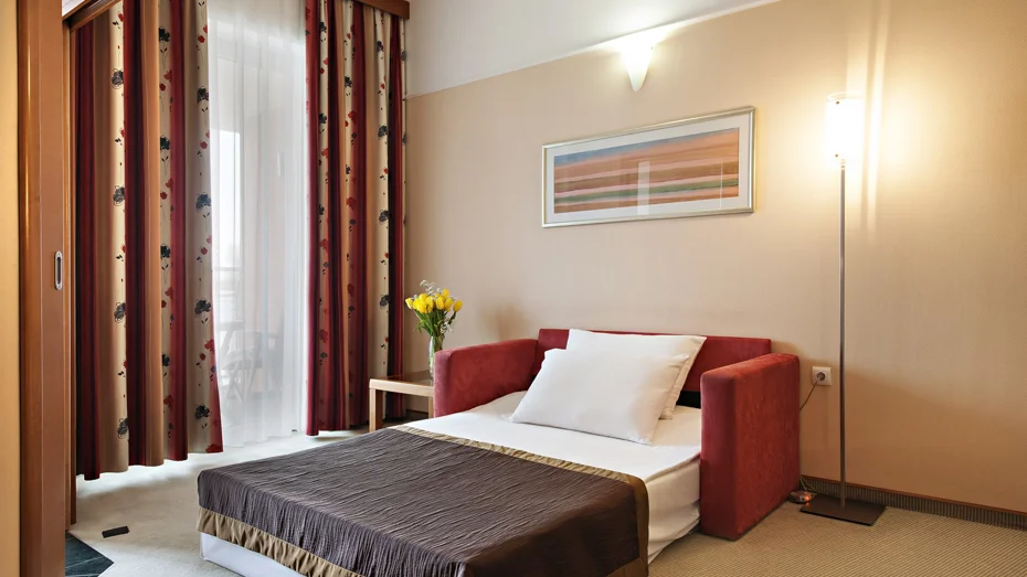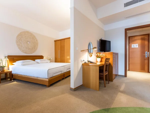 Controllate la disponibilitàElegante e confortevole camera doppia con balcone offre un letto di 180 cm o due letti separati di 90 cm. La camera di 38 m2 dispone di scrivania, divano, bagno con vasca e doccia con acqua sia termale che normale, bagno separato con doccia e toilette.