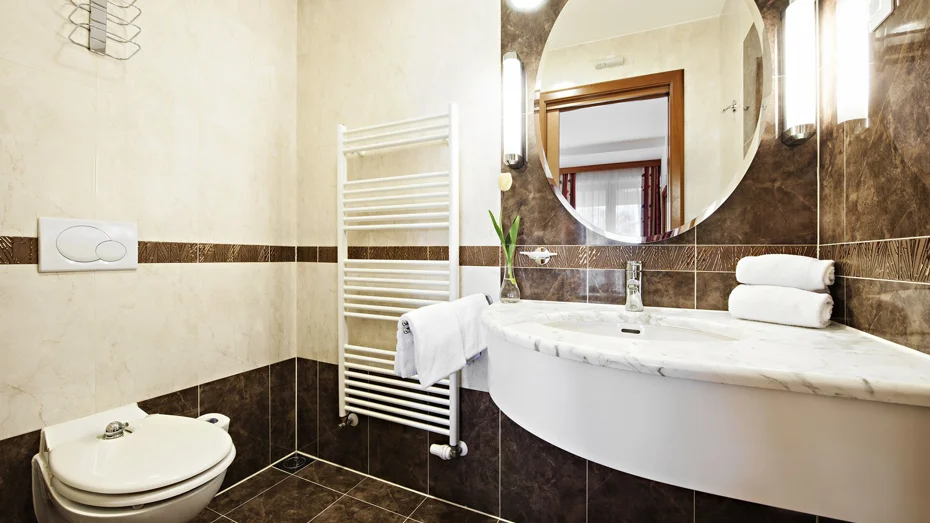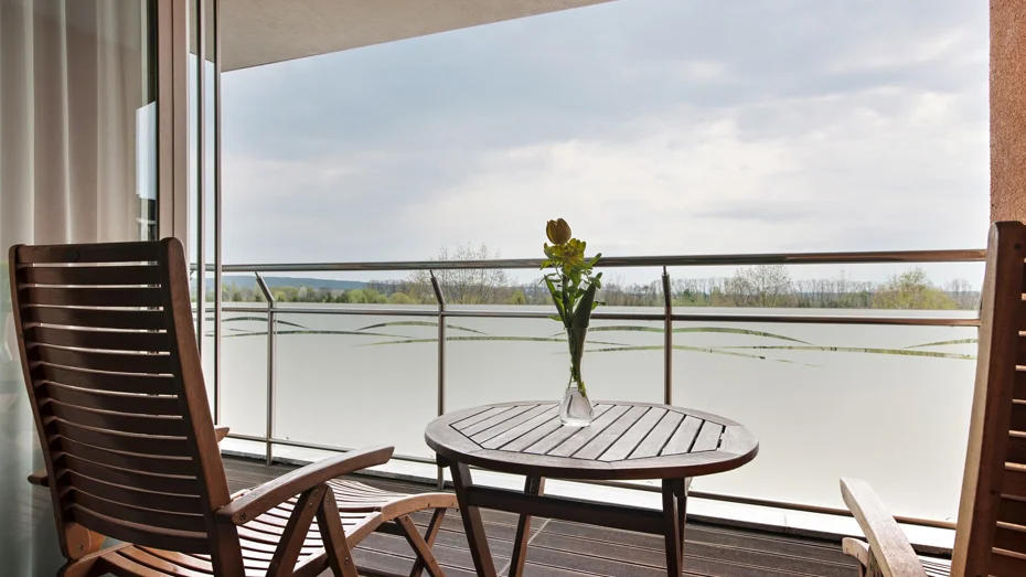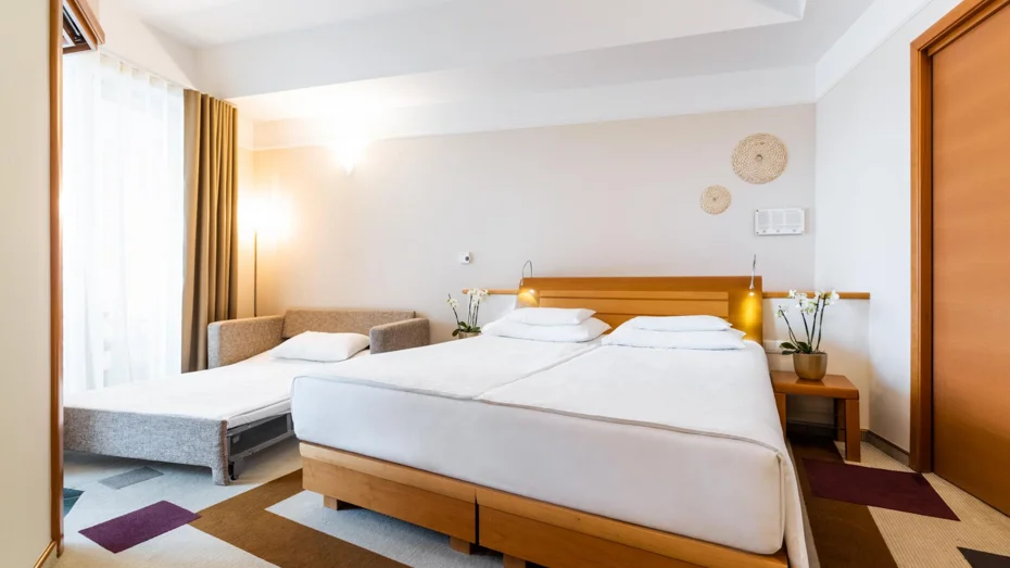 Elegante e confortevole camera doppia con un letto di 180 cm oppure due letti separati di 90 cm e balcone. La camera di 33 m2 dispone di scrivania, divano (letto aggiuntivo), bagno con vasca con acqua sia termale che normale, bagno con toilette.