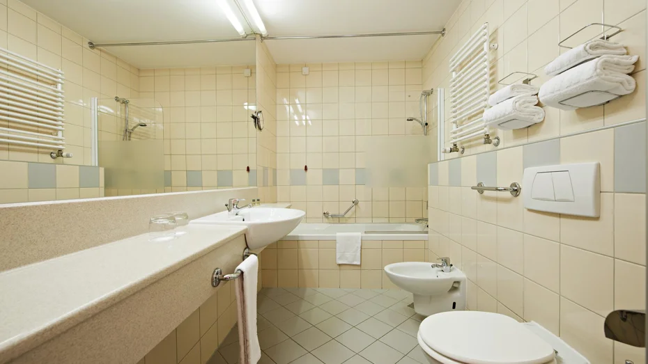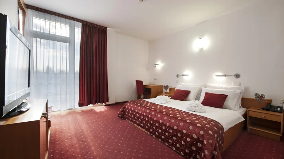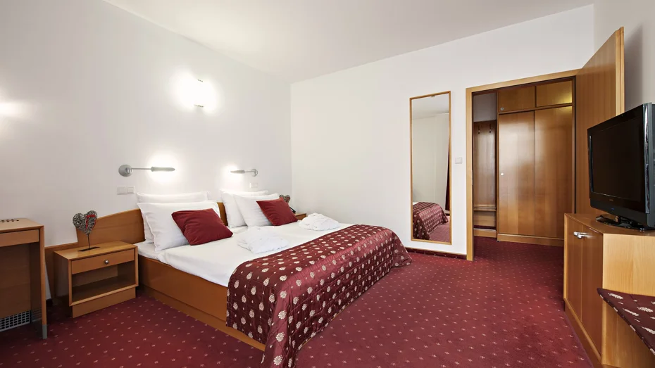 Confortevole camera doppia con letto di 180 cm e vista sul parco. La camera di 28,80 m2 dispone di doccia, toilette e scrivania.
