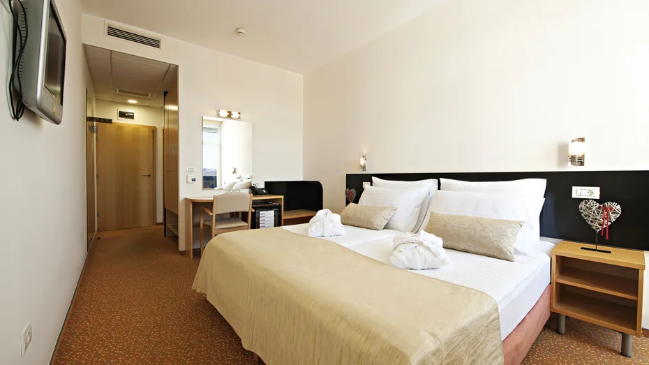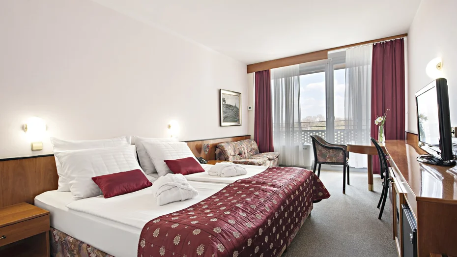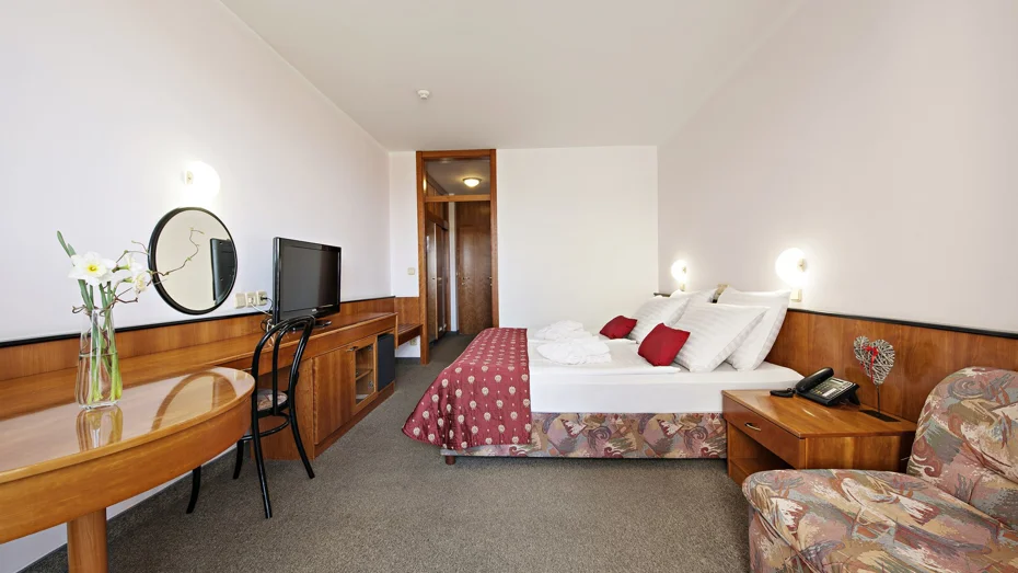 Confortevole camera doppia con un letto di 180 cm o due letti separati di 90 cm. La camera di 23,5 m2 dispone di bagno con vasca e toilette, scrivania e divano monoposto.