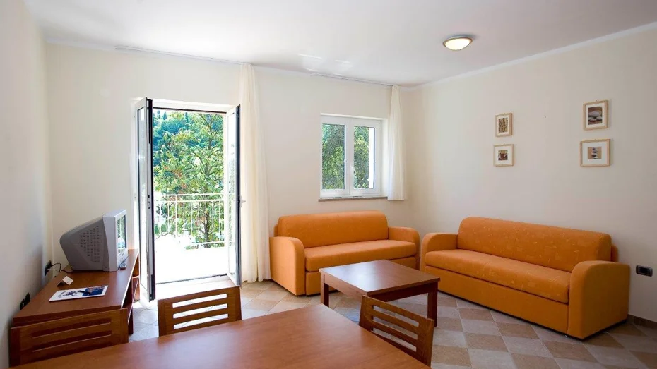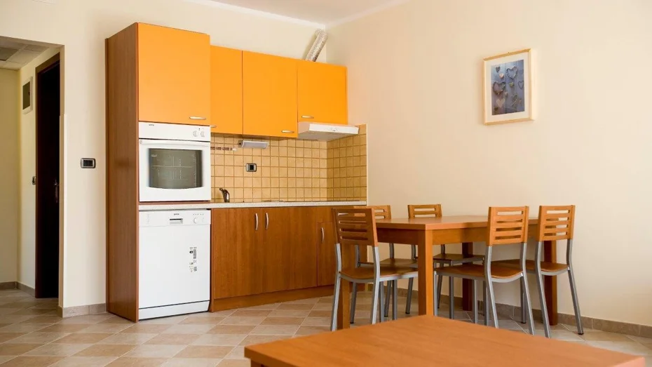 Apartma je opremljen z: klimatsko napravo, pomivalnim strojem, pomivalnim stojem, SAT televizijo in telefonom, sišilcem za lase Apartmaji so sestavljeni iz: dnevne sobe in spalnice, 4 osnovnih in 2 pomožnih ležišč, kopalnice s kadjo, kuhinjske niše, terase ali balkona. Velikost apartmaja: 52m2