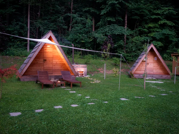 Pričakuje vas 12 lesenih glamping hišk, vsaka z urejenim zunanjim prostorom z udobnimi ležalniki in senčno ponjavo. Nekatere od hišk imajo tudi ogrevane zunanje kadi za romantične trenutke pod zvezdnim nebom.