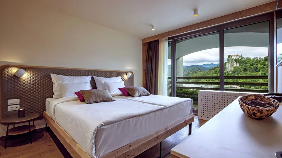 Udobna suita z balkonom in pogledom na jezero. V suiti (45 m2) je spalnica z ležiščem širine 180 cm ter prostorna dnevna soba s televizijo, udobno sedežno garnituro in mizo, grelnikom za pripravo čaja ali kave ter kopalnico s kadjo, tušem in WC-jem in dodatnim WC-jem za goste ter brezplačnim WIFI dostopom.
