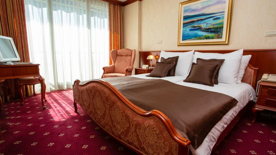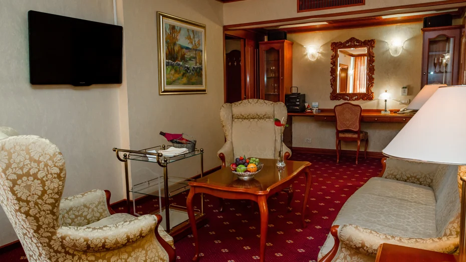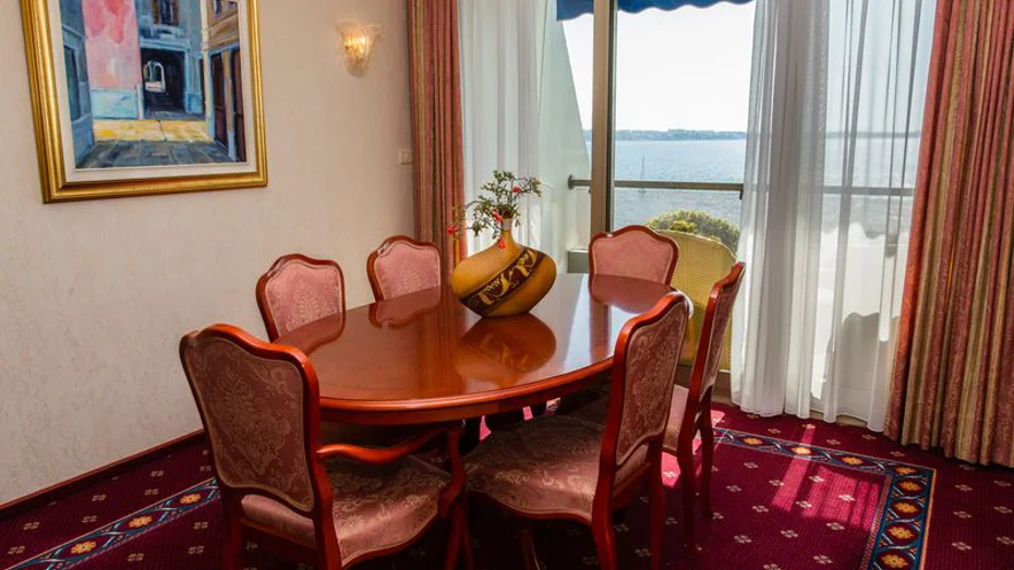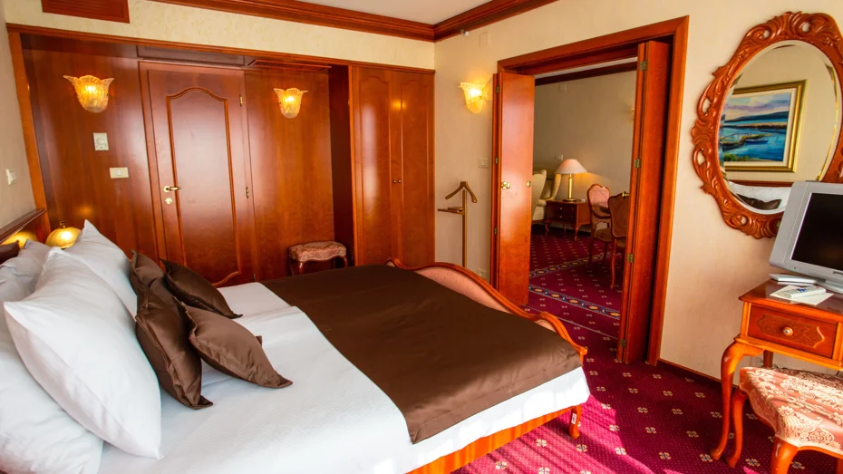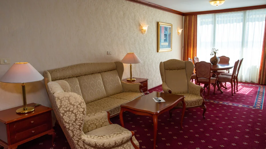 Ponudba v apartmaju: spalnica, predprostor, dnevni prostor, balkon, sef, pisalna miza, mini bar, SAT TV, radio, telefon, kabelski internet, kopalnica z masažno kadjo, sušilec za lase, paket za osebno higieno, kopalni plašč, copati, storitev bujenja/budilka, 24-urna sobna postrežba. Velikost sobe: 73 m2 Velikost postelje: 1 zakonska postelja 210 x 200 cm + 2x raztegljivi kavč 140 x 190 cm