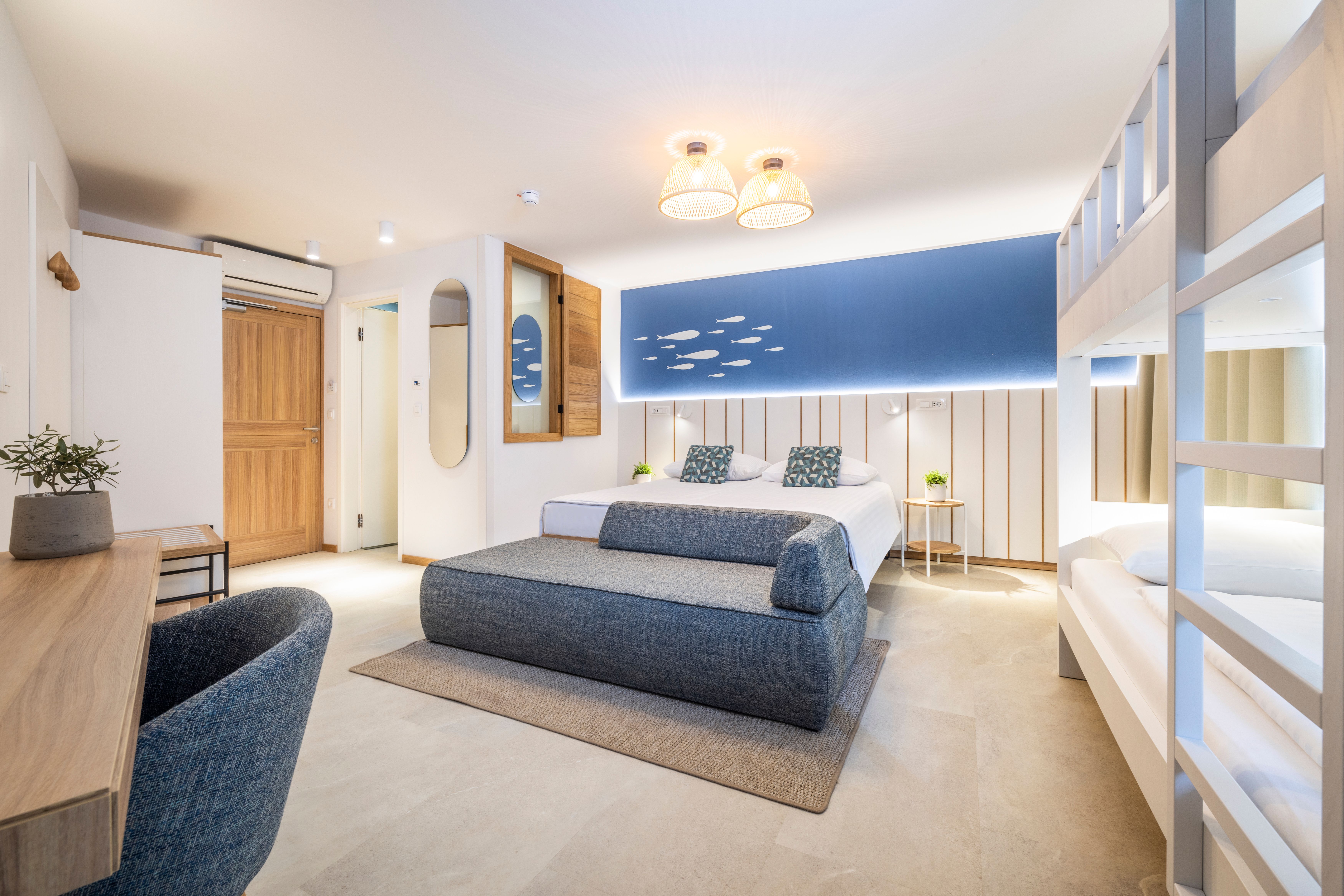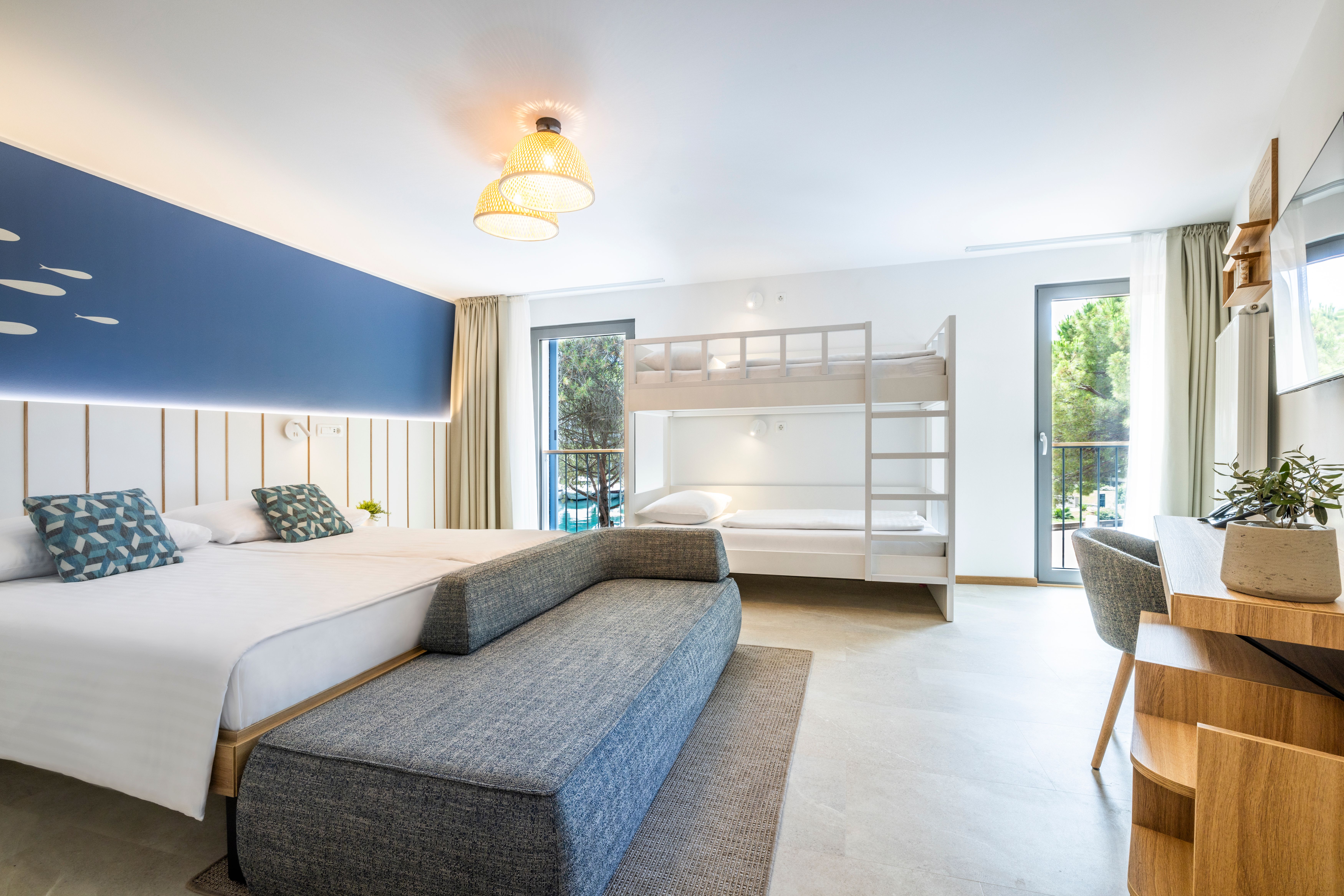 Ponudba sobe: klimatska naprava, kabelska TV, telefon, miza, kopalnica s tušem, sušilec za lase, balkon, mini bar. Velikost sobe: 30 m2 Velikost ležišča: 1 x zakonska postelja 180 x 200 cm + 3 x dodatno ležišče 80 x 190 cm