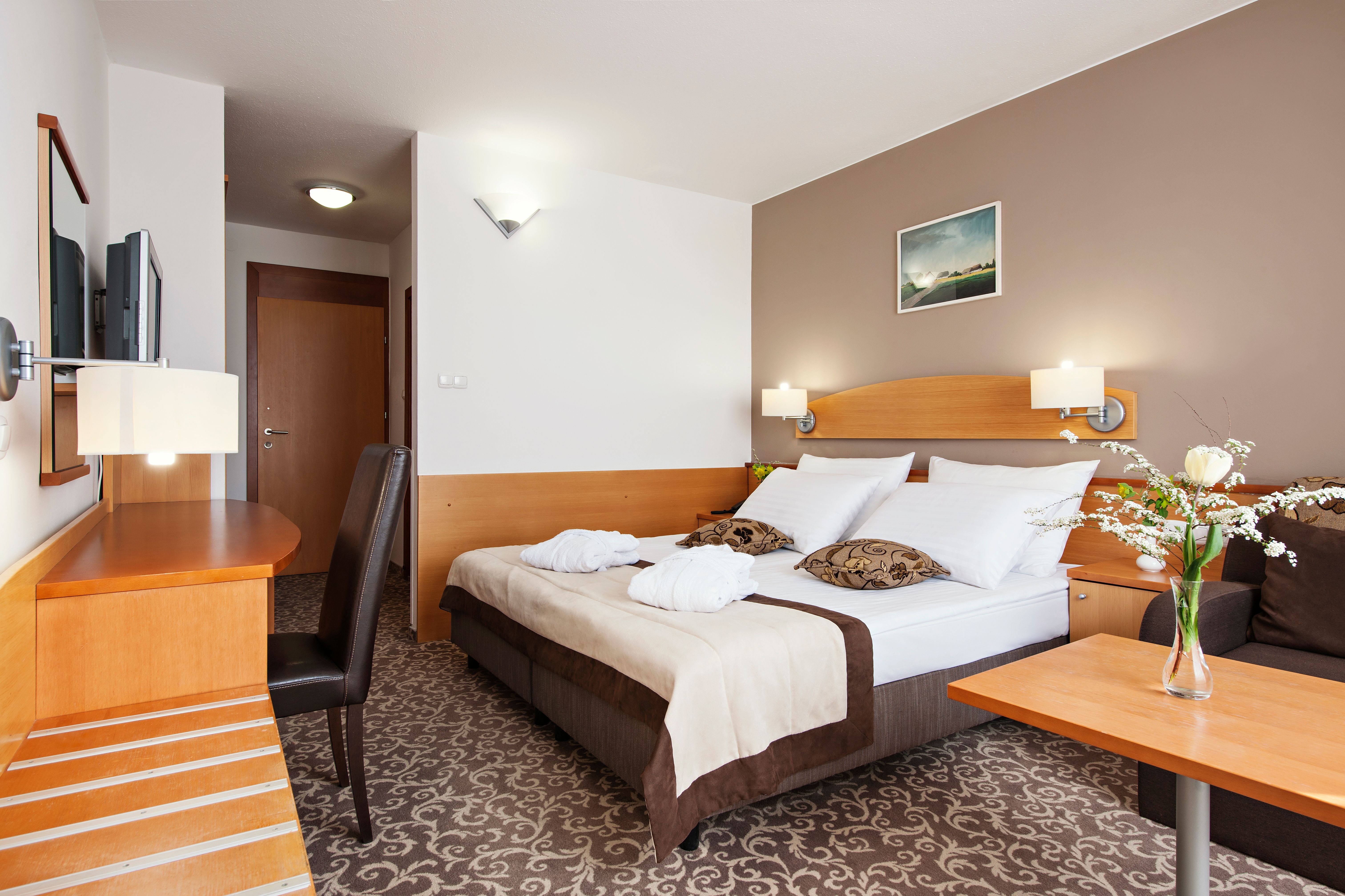 Povezani dvoposteljni sobi z ležiščem širine 180 cm ali ločenima ležiščema širine 90 cm, v vsaki sobi. V sobi (20 m2) je kopalnica s kadjo ali s tušem in WC-jem, pisalna miza ter dvosed.