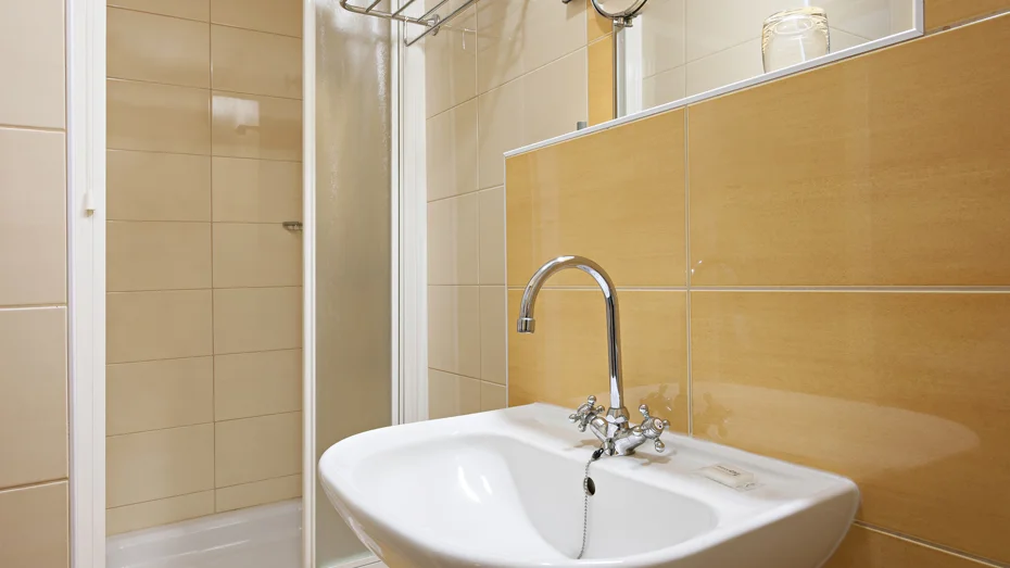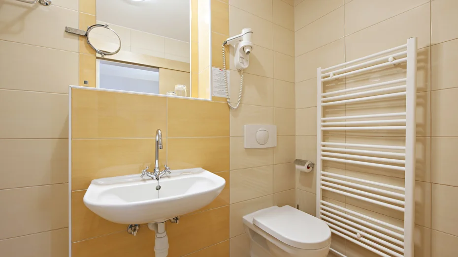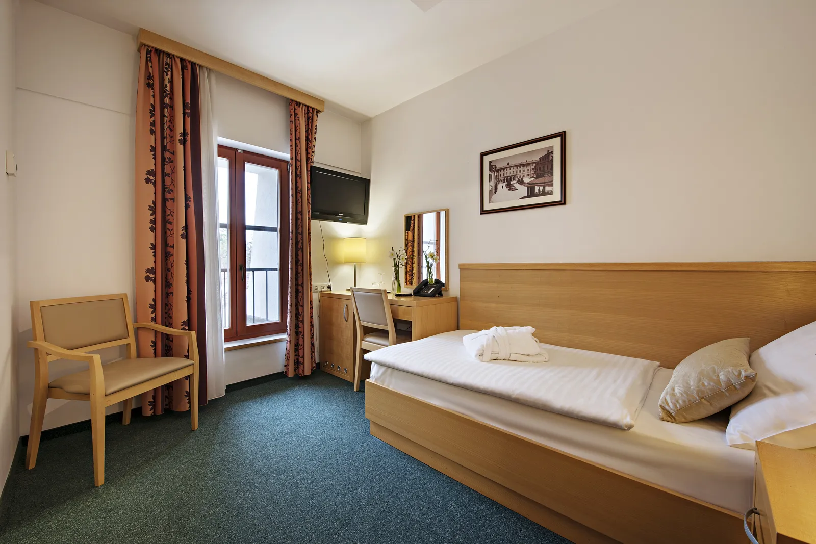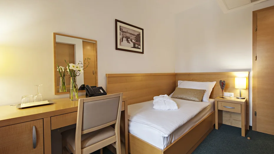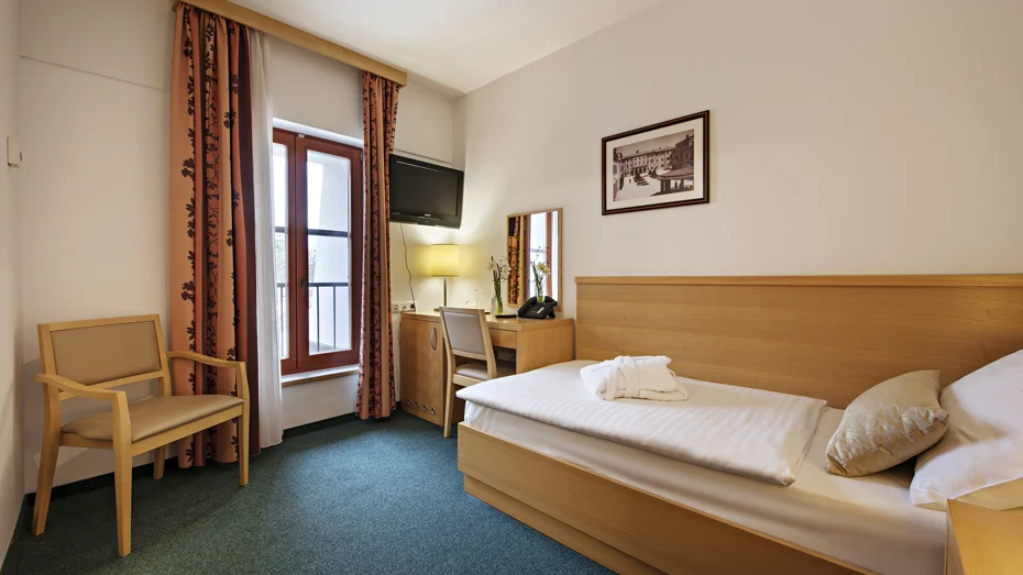 Udobna enoposteljna soba z enojnim ležiščem (90x190 cm) in pogledom na park. V sobi veliki 12,9 m2 je kopalnica s tušem in WC-jem, pisalna miza.